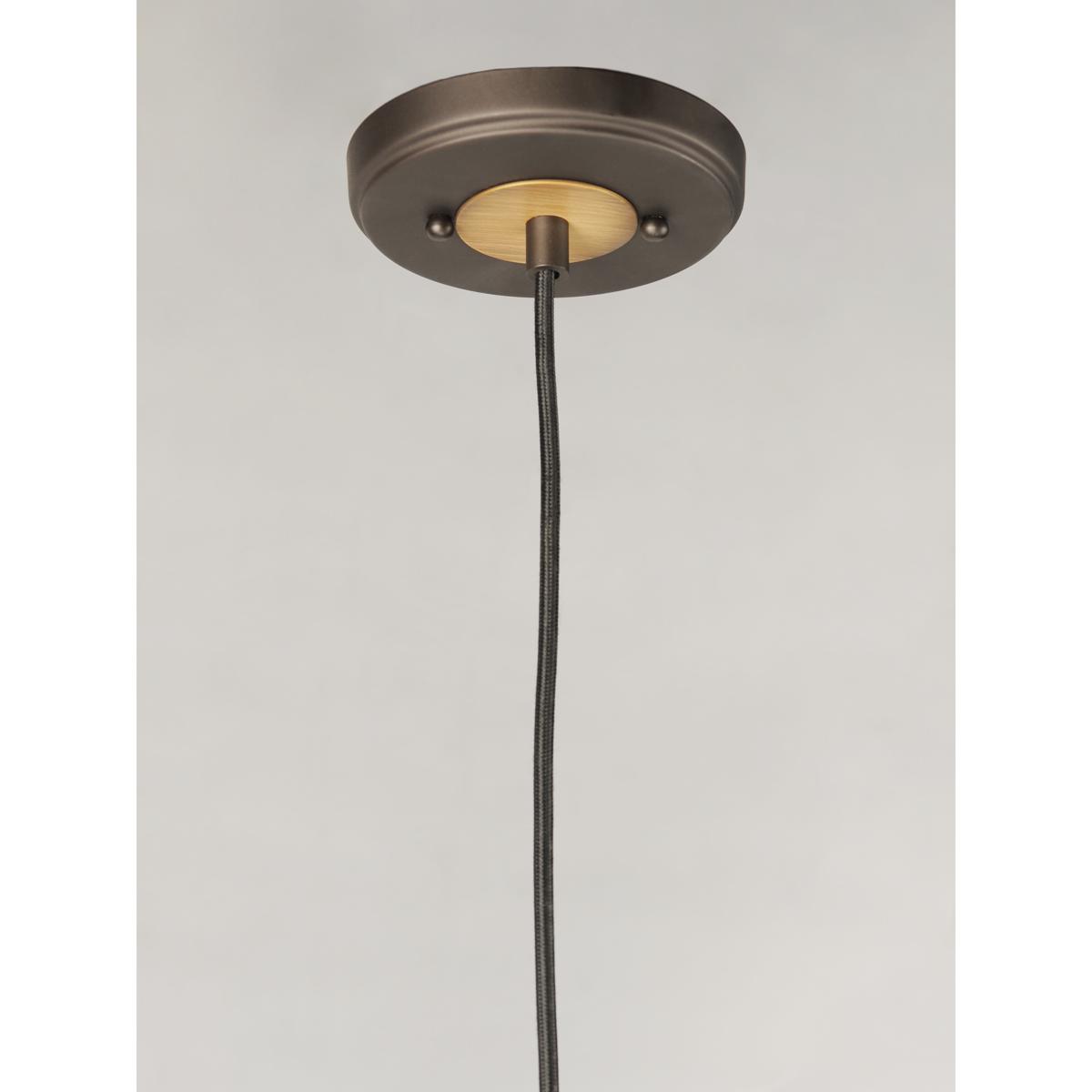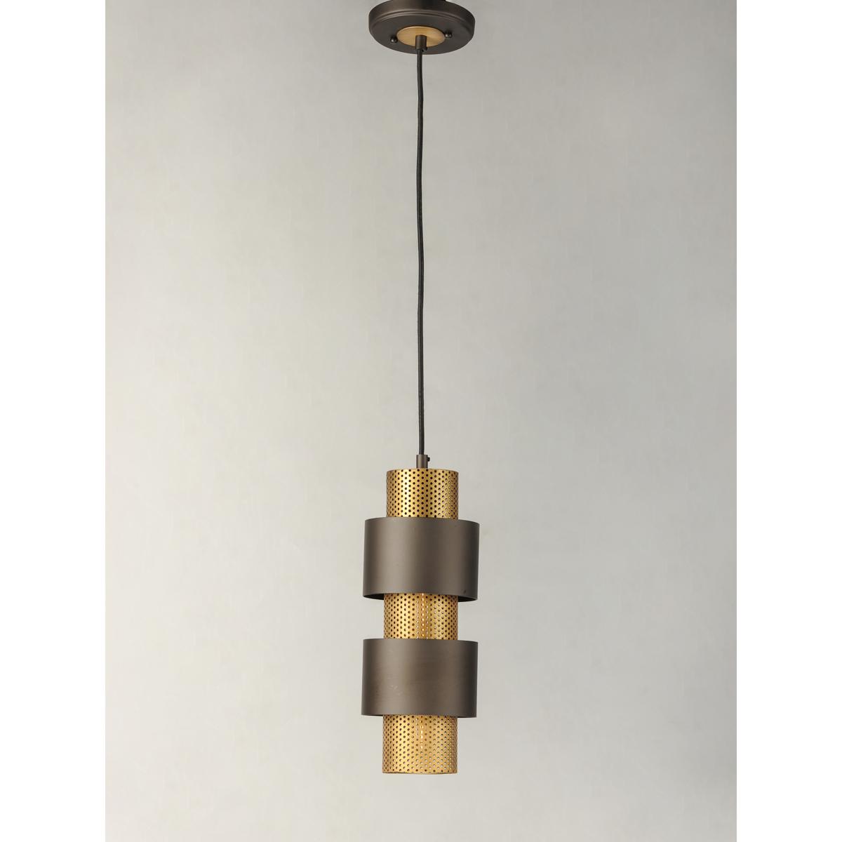 Inner shades of perforated metal are finished in a soft Antique Brass and accented by bands in a complimentary Oil Rubbed Bronze. The light from inside peeks through the perforations and creates an interesting lighting effect. The large scale of the pendants are well suited for larger rooms and hospitality applications.