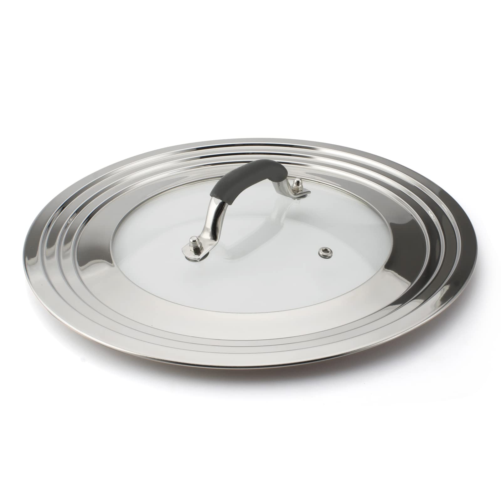 Large Universal Lid: Designed with graduated rim, one lid fits most 11-15 inch frying pans, pots, skillets and woks. EXCEPT pots with two raised handles