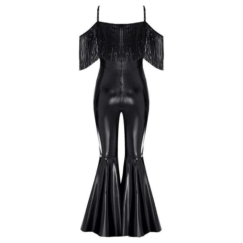 The sparkly sequins and tassels add a touch of glamour and shine, making the jumpsuit stand out and perfect for creating a dazzling look.
