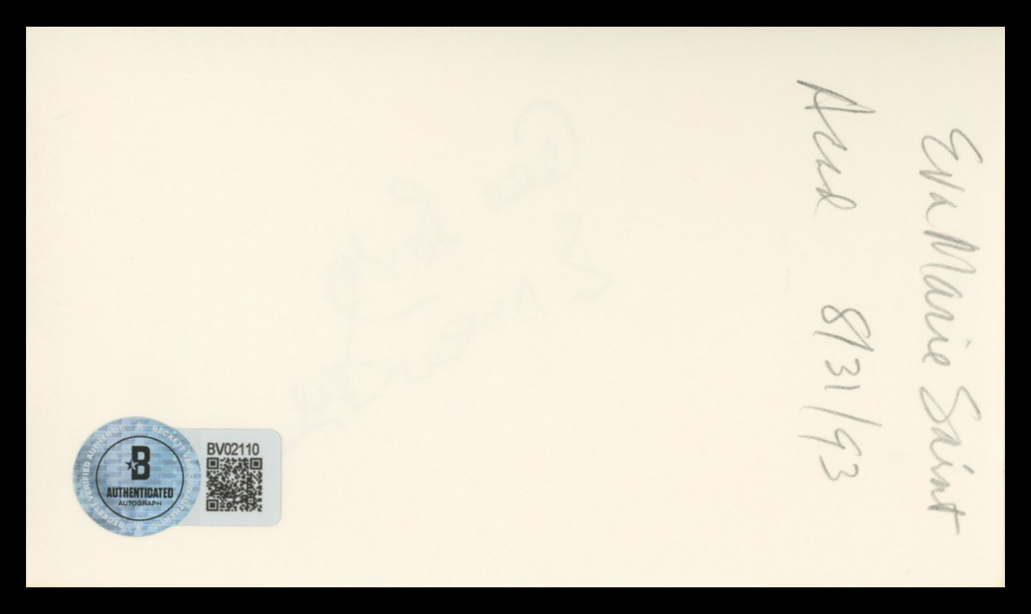 This Autographed 3x5 Index Card has been Personally Signed by Eva Marie Saint of On the Waterfront. This item is 100% Authentic to include a hologram by Beckett Authentication Services. This item will come with an affixed Beckett Authentication Services (BAS) authentication sticker, which includes a scannable QR code to verify authenticity. Please note that Beckett no longer provides serial-numbered COA cards, and the attached BAS sticker will serve as the complete authentication for this item. The authenticity can be verified on Beckett Authentication Services website.