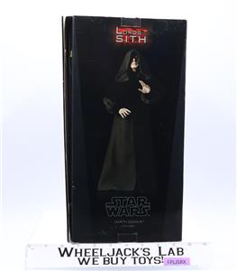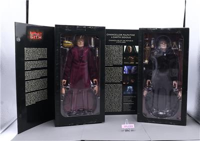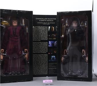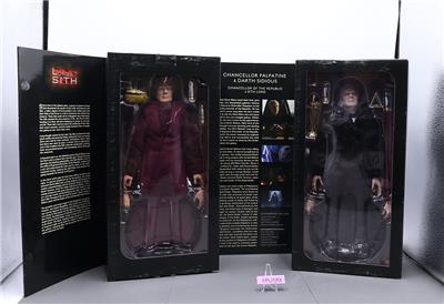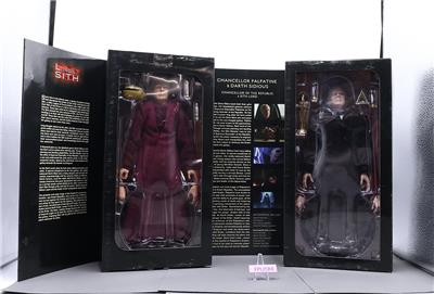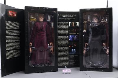 Condition: The box has been opened, but the contents are mint. The packaging has some wear and scuffing. The glue on the box holding Darth Sidious has dried, which has caused the packaging to come undone. Comes as shown.