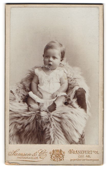 Fotografie Samson & Co, Frankfurt a. M., Zeil 46, Süßes Baby in weißem Kleid mit erstauntem Blick