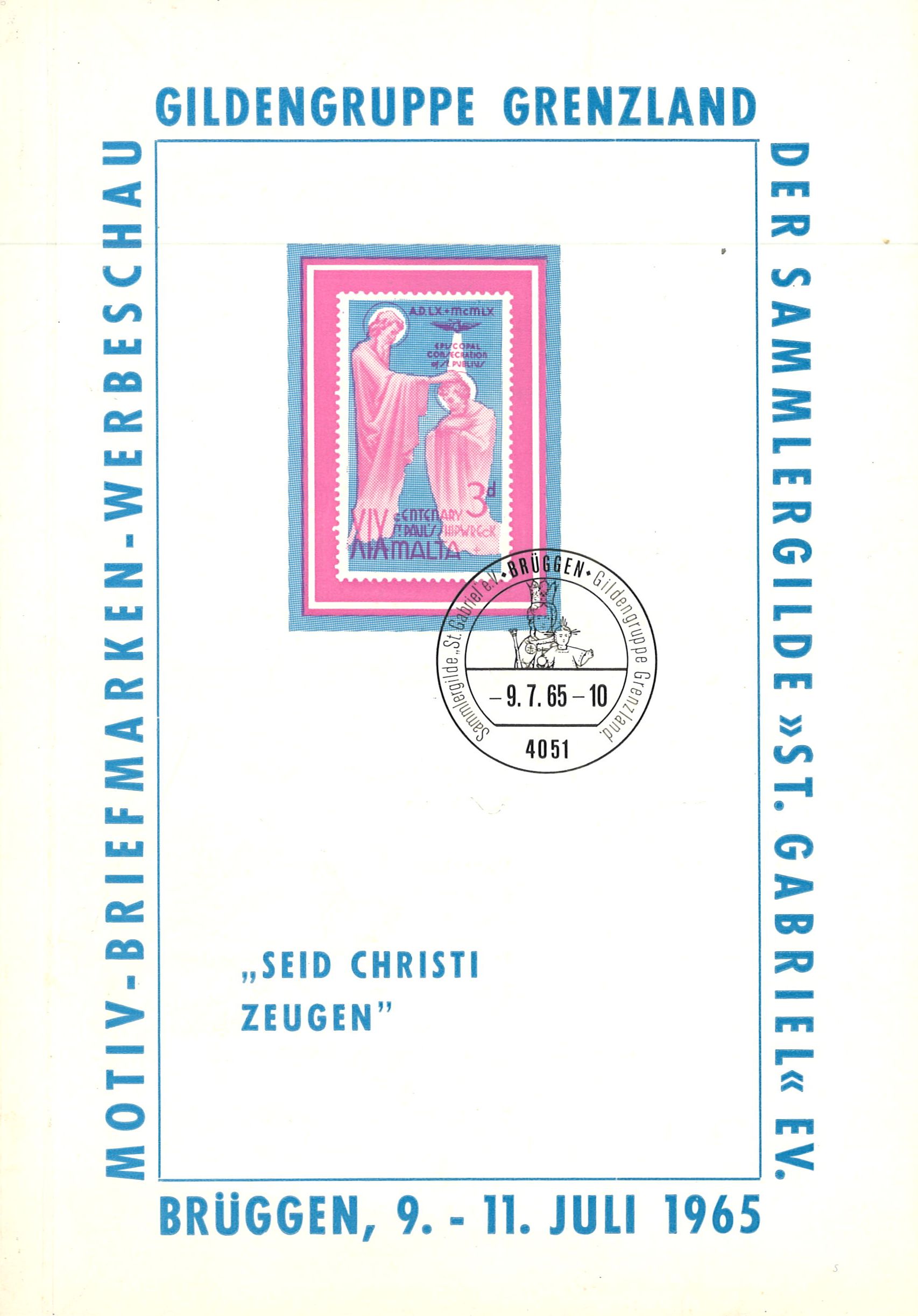3.) Ausstellungskatalog der Motiv-Briefmarken-Werbeschau "Seid Christi Zeugen" der Sammlergilde St. Gabriel, Juli 1965, Format A5, 46 Seiten, broschiert, gut erhalten