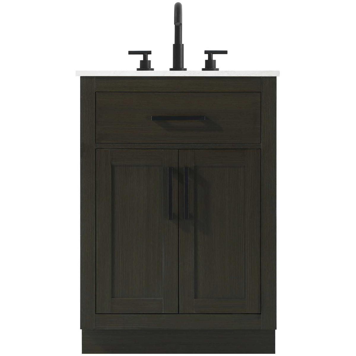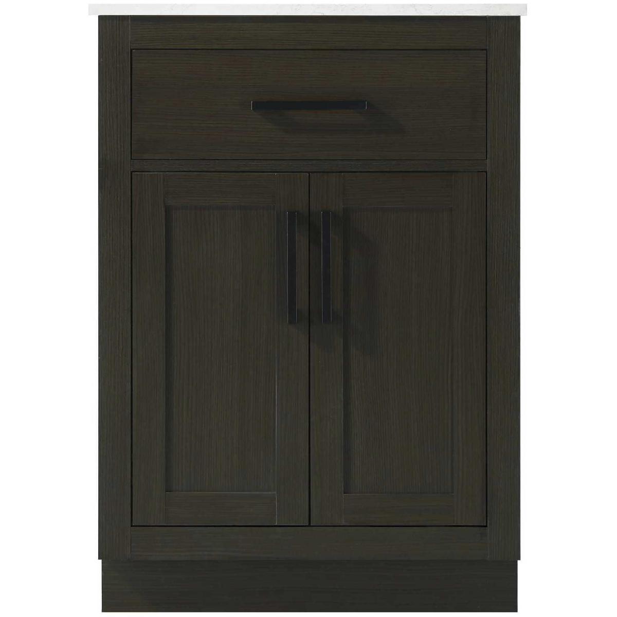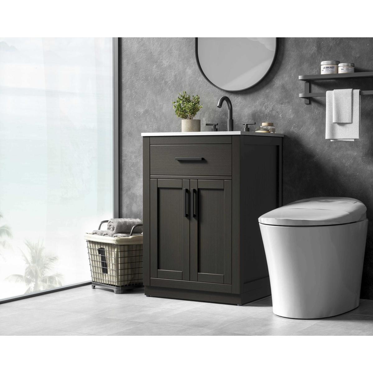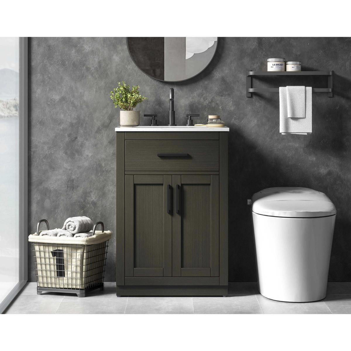 Introduce a perfect balance of functionality and style to your bathroom with this thoughtfully designed vanity. Constructed with a combination of solid wood and MDF, it offers durability and a sturdy build. The sleek engineered marble countertop with subtle grey marbling complements the rustic wood grain finish, creating a stylish and inviting centerpiece for your bathroom. Designed in a contemporary style with a transitional flair, it features a U-shaped shelf for seamless plumbing integration and multiple soft-close drawers for clutter-free organization. A pull-down drawer enhances convenience, while the toe kick adds a refined, clean-lined appearance and simplifies cleaning underneath. Matte black hardware contrasts beautifully with the cabinet finish, tying the look together. Delivered fully assembled and equipped with foot levelers, this vanity combines practicality and aesthetic appeal to suit modern and transitional bathrooms alike.
