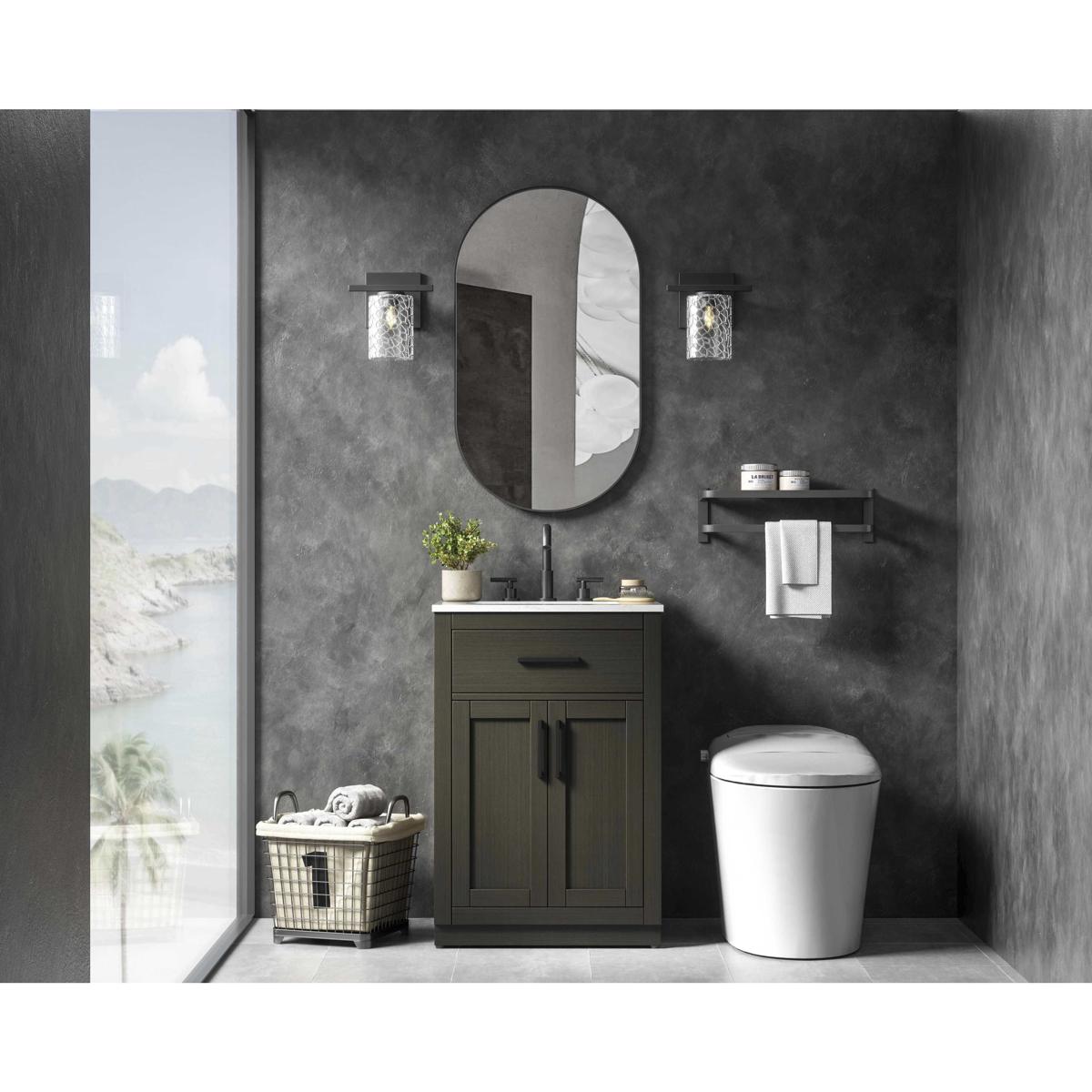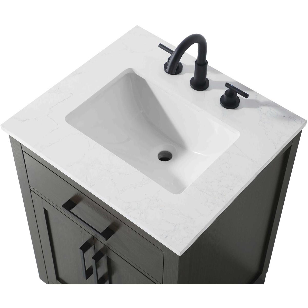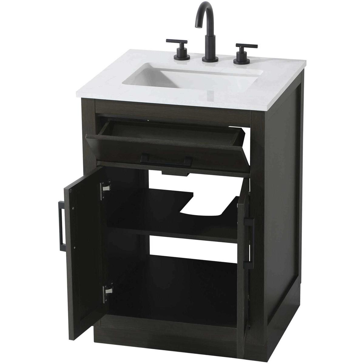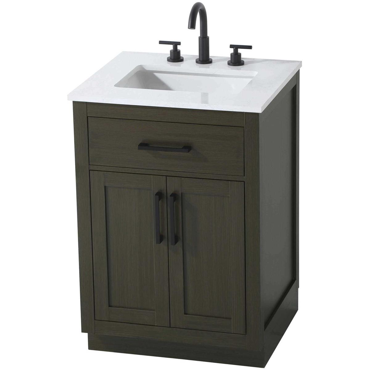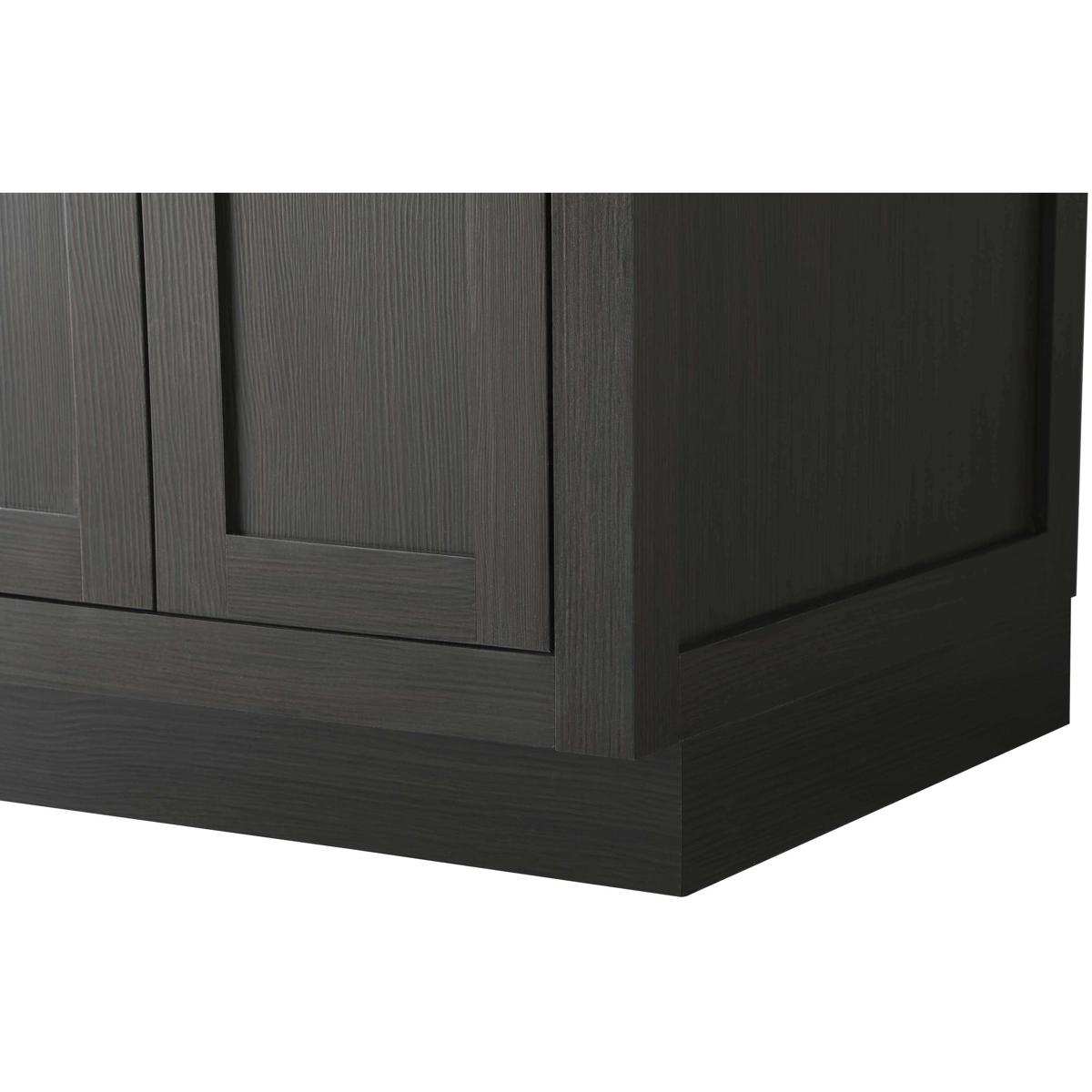 Introduce a perfect balance of functionality and style to your bathroom with this thoughtfully designed vanity. Constructed with a combination of solid wood and MDF, it offers durability and a sturdy build. The sleek engineered marble countertop with subtle grey marbling complements the rustic wood grain finish, creating a stylish and inviting centerpiece for your bathroom. Designed in a contemporary style with a transitional flair, it features a U-shaped shelf for seamless plumbing integration and multiple soft-close drawers for clutter-free organization. A pull-down drawer enhances convenience, while the toe kick adds a refined, clean-lined appearance and simplifies cleaning underneath. Matte black hardware contrasts beautifully with the cabinet finish, tying the look together. Delivered fully assembled and equipped with foot levelers, this vanity combines practicality and aesthetic appeal to suit modern and transitional bathrooms alike.