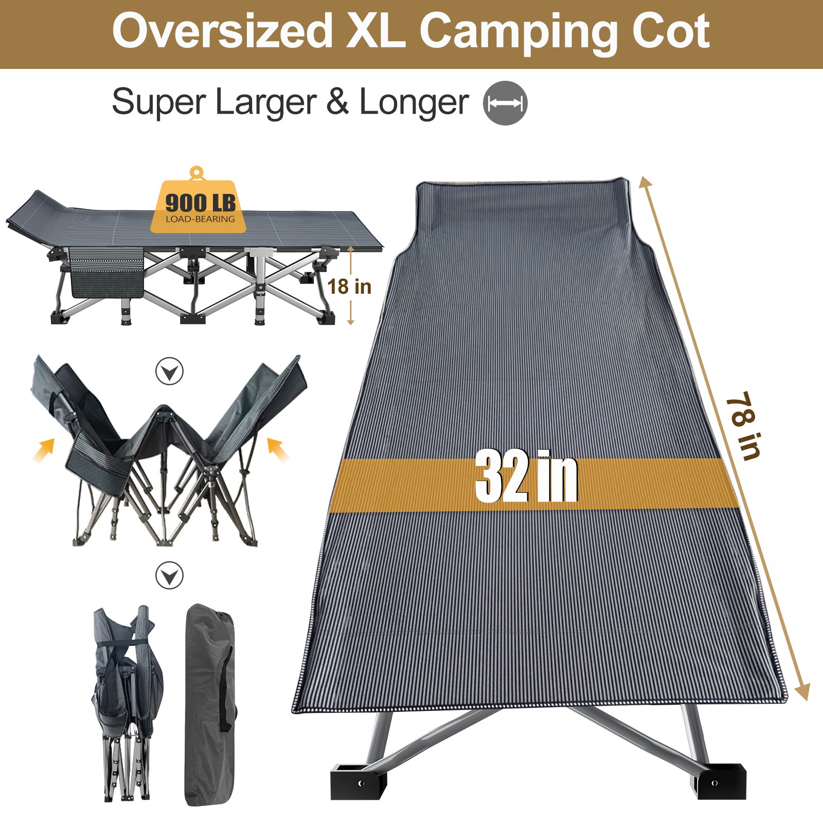 Folding Camping Cot, Lightweight Portable Heavy Duty Adult & Kids Travel Cot Supports up to 900lbs. Can bear 1 adult or 2 children sleeping on it to rest. Quality double layers 1200D polyester fabric and steel frame. Equipped with 2 Sided mattress, you can sleep more comfortably in this portable folding camping bed. Soft cushions add extra comfort. In hot weather, the cushion can also be taken away for the breathable. No need for troublesome installation. Our foldable cot opens in less 10 seconds, light weight, easy-to-fold. Unfolded Dimension: 75"* 32"*18". Weighs approximately 26.46 lb A carry bag with a handle is available. Easy to take it out for camping. Great folding cot,outdoor cot,camping cot with mattress, for hiking, camping, traveling, hunting; or as a snap cot in the office; also a perfect temporary bed when guests visit your home.