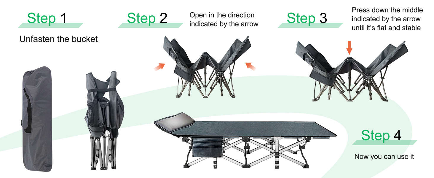 1.The folding bed may be a little tight when first opened, the bed will be flattened by pressing the middle of the bed with your hand and pressing the other end of the bed with the other hand. If you accidentally pour water onto the folding bed during use, please dry it and then fold it up. When not in use, please put it in the carry bag and store it in a dry and ventilated environment to make the product last longer.