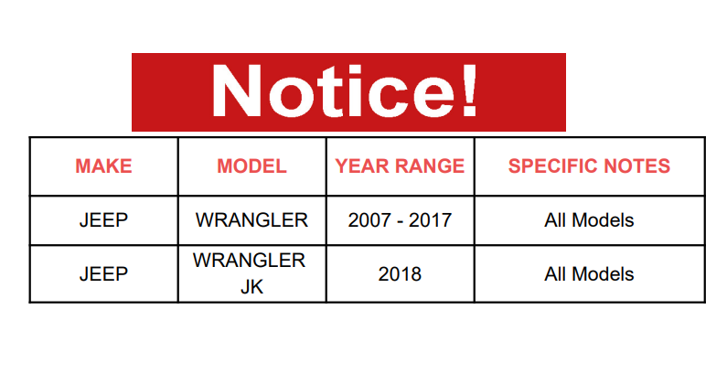 | JEEP | WRANGLER | 2007 - 2017 | All Models |