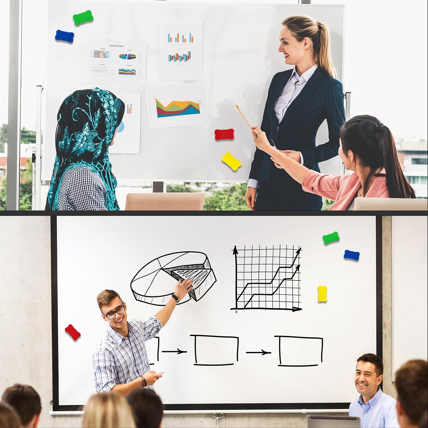 Built-in magnets to stick firmly to whiteboards, refrigerators, and metal surfaces.