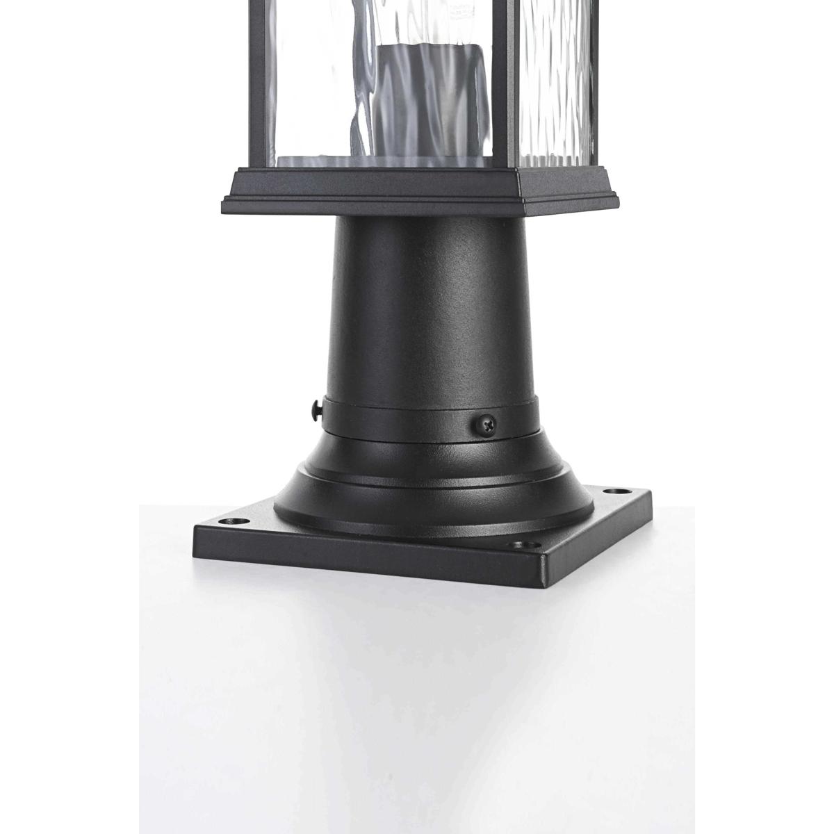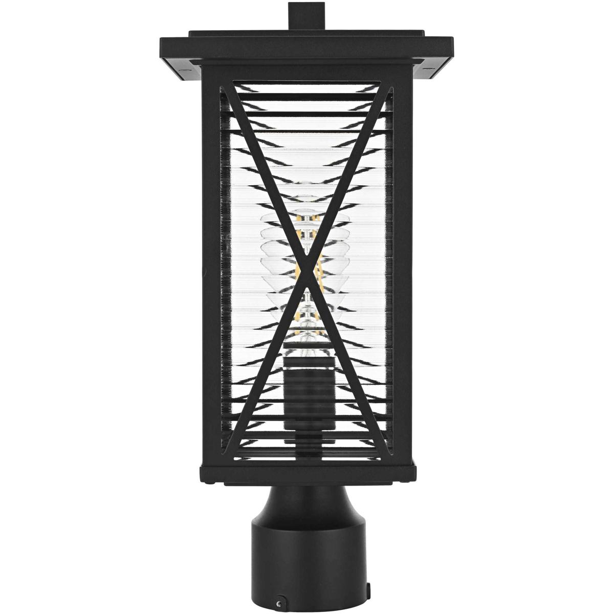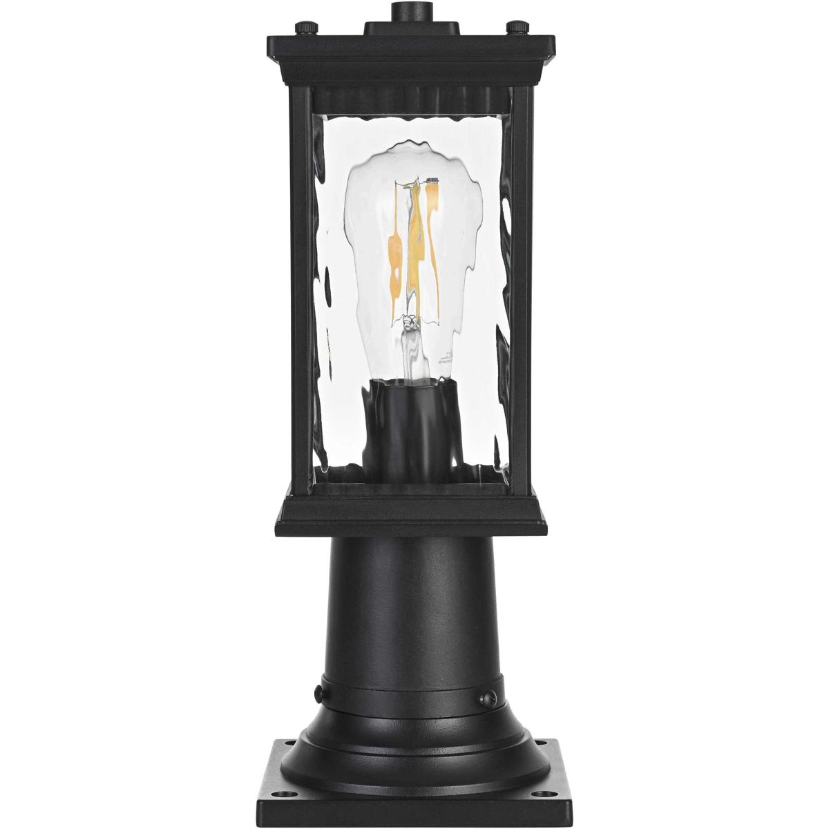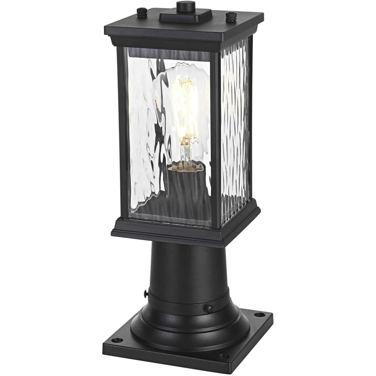 This outdoor post light brings an instant touch of sophistication to your exterior décor. Crafted with an aluminum frame, the design features a distinctive rectangular shape with slightly flared accents at the top and bottom for added visual interest. The rippled glass panels enclose an E26 socket, designed to accommodate a traditional Edison-style bulb, which casts a warm and inviting glow. The combination of a sturdy aluminum frame and the rippled glass texture creates a timeless aesthetic, perfect for creating a cozy ambiance on porches, entryways, or patios. Its matte black finish ensures this post light can seamlessly blend into modern, farmhouse, or transitional styled homes, while the durable construction ensures that it stands the test of weather and time.