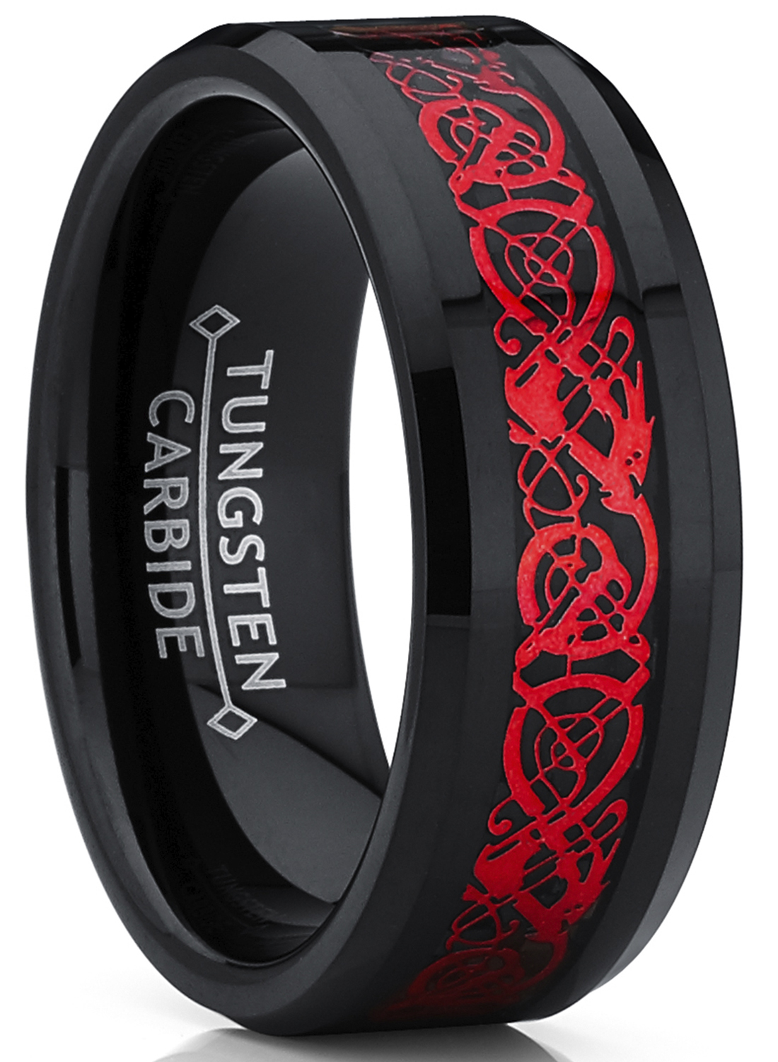 Elevate your style with this Men's Black Tungsten Red Dragon Ring, a perfect blend of legendary design and modern durability. Crafted from genuine tungsten carbide, this 8mm wedding band is exceptionally scratch-resistant and built to withstand the rigors of daily wear. The centerpiece features an intricate red Celtic dragon set against a sleek black carbon fiber inlay, framed by high-polish beveled edges for a sophisticated, multi-dimensional look. Designed with a comfort fit interior, this ring ensures ease of wear throughout the day, making it an ideal choice for a wedding band, engagement ring, or a meaningful gift for any special occasion. Each ring comes with a complimentary jewelry box, ready for presentation and secure storage.