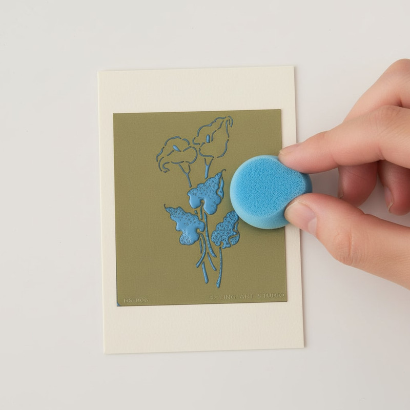 Mit einem kleinen Schwämmchen oder einem feinen Pinsel tupfst du etwas Farbe durch die Aussparungen. Das ergibt einen weichen, natürlichen Effekt, den du für viele Bastelprojekte einsetzen kannst.