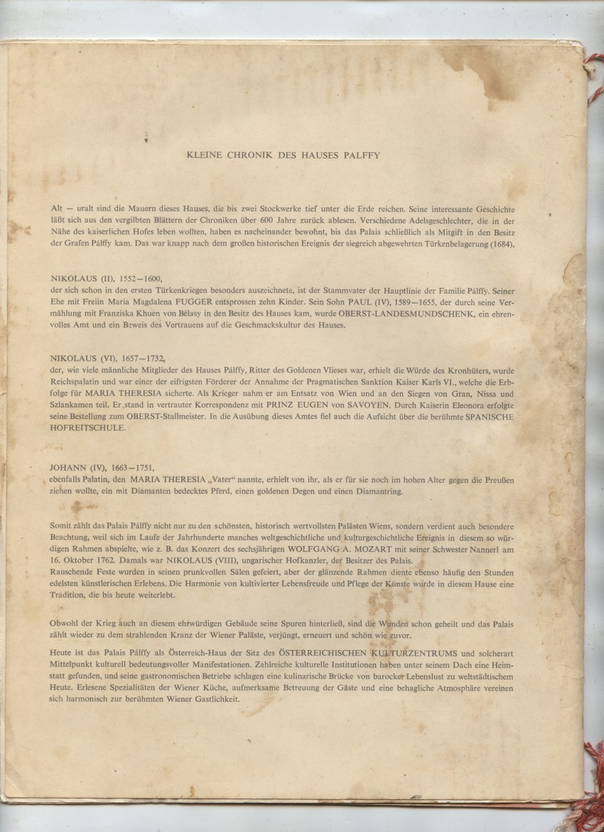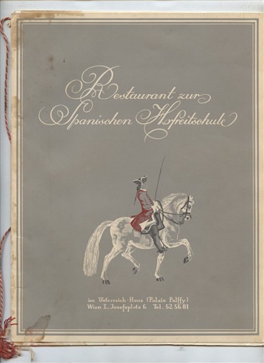 A 10 page menu in menu cover. Restaurant Zur Spanischen Hofreitschule Menu . The Spanish Riding School Cafe in Vienna Austria. Measures about 8 1/4" x 11" when closed. Due to the size limitations of my scanner, the entire menu may not show in some of the scans.