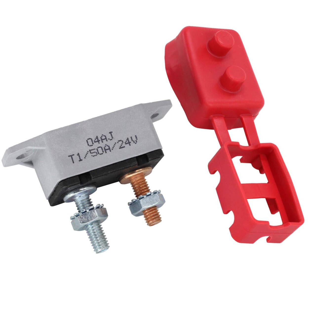 Specification:Rated voltage: 6-28VRated current:10A/15A/20A/30A/40A/50AApply to 6-28VDC applicationPlastic body and mounting bracket#10-32 bolt length. 66In (16.8mm); bolt spacing.69in (17.5mm)Wing spacing: 1.56in (39.6mm)Interruption rating: 2.5KA @ 28VdcOperating temp: -40°C to 85°C (-40°F to 185°F)Storage temp: -40°C to 125°C (-40°F to 260°F)Torque grade: 15in-lbIP66 waterproofing: IP66 on plastic cover (except for terminal)Conformance: SAE JGG3; SAE J1171 (ignition protection level)Package Included: 1x 50A Automatic Reset Circuit Breaker With Red Cover