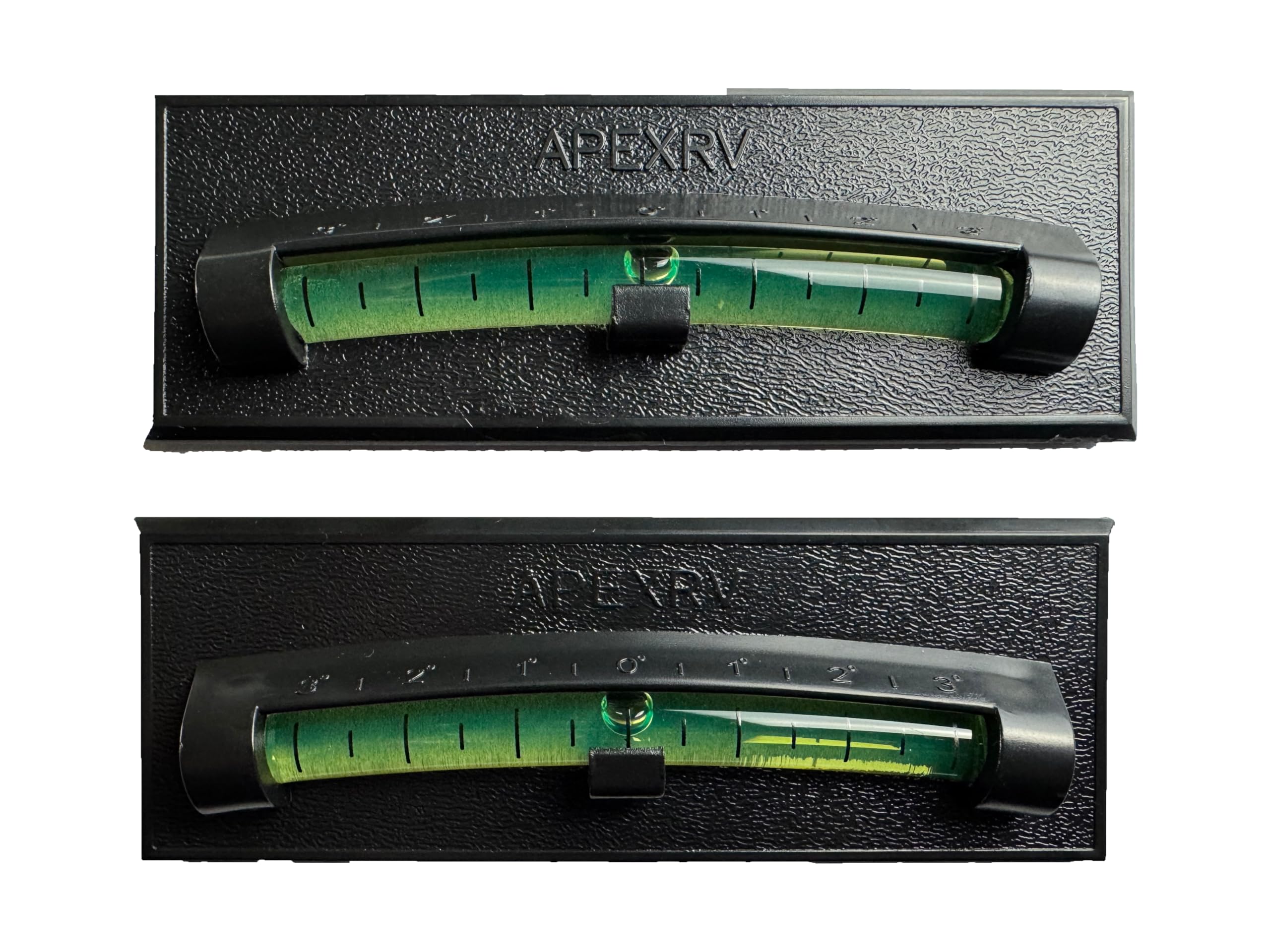 Apex RV Graduated Level – Precision. Durability. Confidence on Every Terrain. When you're hitting the open road in your RV, camper, trailer, or off-road rig, precision matters. Uneven terrain can throw off your vehicle’s balance, compromise your comfort, and even affect the performance of essential systems. That’s why you need a leveling tool engineered for accuracy, visibility, and rugged durability. Introducing the Apex RV Graduated Level, your go-to solution for reliable, long-lasting, and easy-to-read leveling on any surface. Designed with adventurers in mind and crafted with high-quality materials, the Apex RV Graduated Level brings together innovative engineering and tough construction to provide you with the ultimate in leveling precision—wherever your journey takes you. Unmatched Visibility with Fluorescent Liquid for Clear Indication One of the standout features of the Apex RV Graduated Level is its fluorescent leveling liquid, designed to offer high visibility in all lighting conditions. Whether you're leveling at dusk, dawn, or under a shaded canopy, the brightly tinted green liquid ensures you can easily read your bubble level without squinting or second-guessing. The bubble moves smoothly across a high-contrast background, providing an instant visual cue that helps you find level in seconds. This fluorescent liquid doesn’t just look good—it performs flawlessly, even when the sun’s gone down. Graduated Scale for Precision Accuracy Not all bubble levels are created equal. The Apex RV Graduated Level features a precision-etched scale that offers a full -3° to +3° tilt range. This finely graduated display allows for more detailed adjustments than traditional one-bubble levels, enabling you to dial in the perfect angle for everything from trailer stabilization to RV appliance calibration. With Apex, you’re not just “roughly level”—you’re perfectly calibrated. The graduated markings are sharp, clear, and designed to be fade-resistant, so your level stays accurate and readable for years to come. Never Fade, Always Accurate Crafted using UV-resistant materials, the Apex RV Graduated Level is built to withstand the sunniest, dustiest, and most extreme outdoor conditions without degrading over time. The markings on the tube and body are guaranteed never to fade, ensuring a clean, professional appearance and accurate readings throughout the life of the product. Unlike cheaply made levels that warp, discolor, or crack after a season of use, the Apex Level stays sharp and solid—just like your sense of adventure. Built to Last with Rugged, Weatherproof Design The road ahead can be unpredictable, but your gear shouldn’t be. That’s why the Apex RV Graduated Level is built with industrial-grade ABS plastic and flex-resistant tubing. This robust construction is resistant to shocks, vibrations, and temperature fluctuations—ideal for life on the road or off the grid. Whether you’re leveling on a rocky mountainside, sandy desert, or forested slope, the Apex Level remains reliable and intact. It's made to be long-lasting, giving you peace of mind on every outing. Fast & Flexible Installation – Your Way We know every RV setup is different, which is why the Apex RV Graduated Level includes dual mounting options. For those who want a clean and simple setup, strong adhesive backing allows for a quick, no-drill installation—just peel and stick. For a more secure and permanent solution, pre-drilled holes are available so you can screw the level into place on any flat surface. Mount it vertically, horizontally, or on the dash—whatever works for your rig. The compact size makes it easy to fit into tight spaces without sacrificing readability. Smooth Damped Bubble Action One of the most underrated features in a leveling tool is how the bubble behaves in motion. The Apex Level uses a fluid-damped system that allows the bubble to move smoothly and gradually, avoiding jumpy or erratic readings. This not only provides a more accurate assessment but also gives you a better “feel” as you make leveling adjustments. Whether you’re using leveling blocks, jacks, or built-in leveling systems, you’ll be able to fine-tune with precision—no more constant back-and-forth repositioning. Compact and Travel-Ready Measuring just 1.5"L x 4"W inches, the Apex RV Graduated Level is compact enough to fit anywhere, yet large enough to offer excellent readability from a distance. Toss one in your toolkit, glove box, or mount it on your rig permanently. Each pack comes with two levels, so you’ll always have a backup or an extra for a second vehicle or trailer. Apex Advantage – Where Precision Meets Reliability When you choose Apex, you're choosing a brand that puts function first without compromising on quality or durability. The Apex RV Graduated Level is the result of thoughtful design, field testing, and feedback from real-world users who depend on their gear every day. We know what matters: visibility, precision, and long-term durability. That’s w