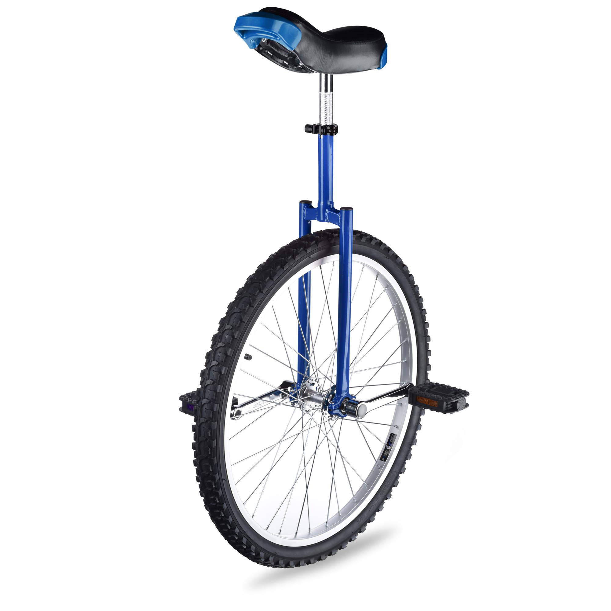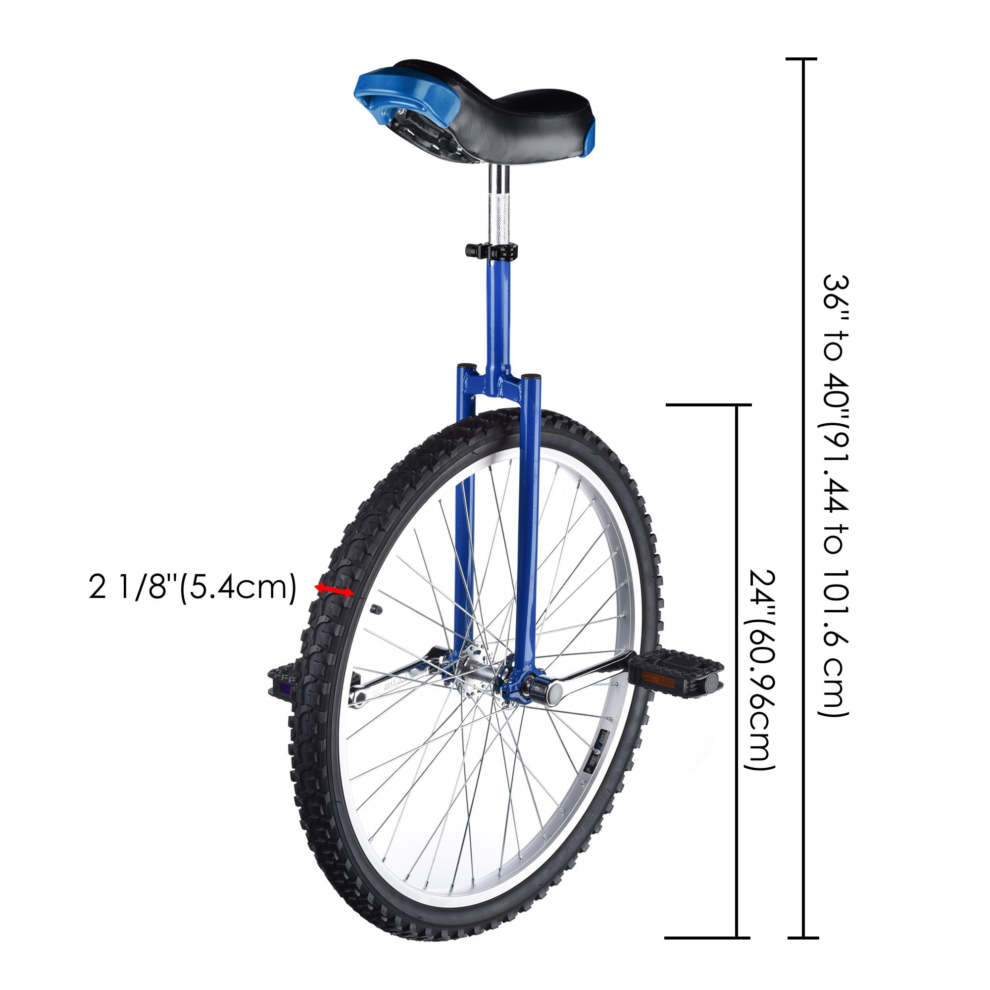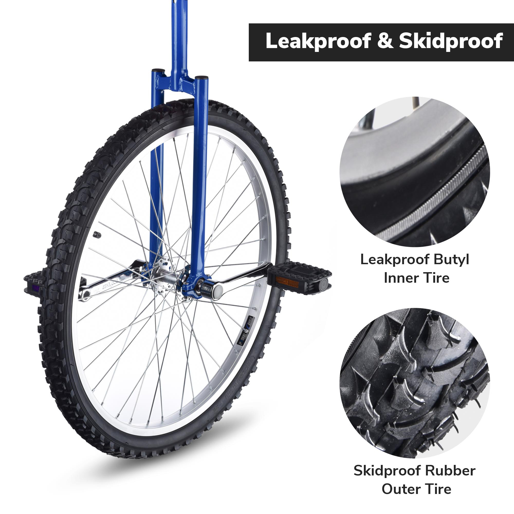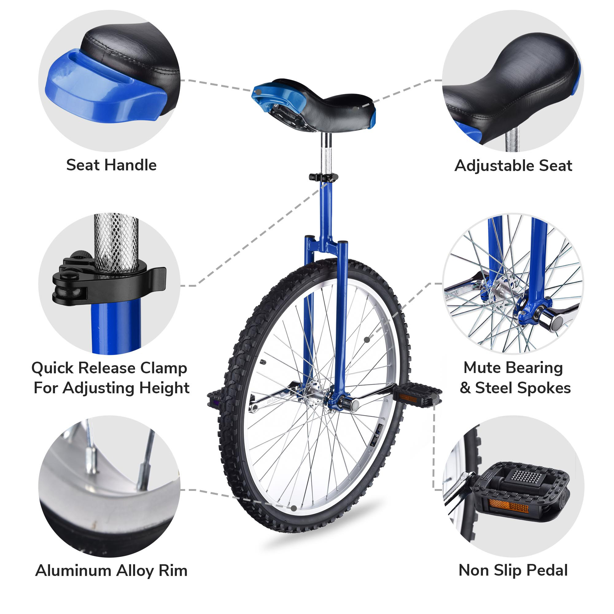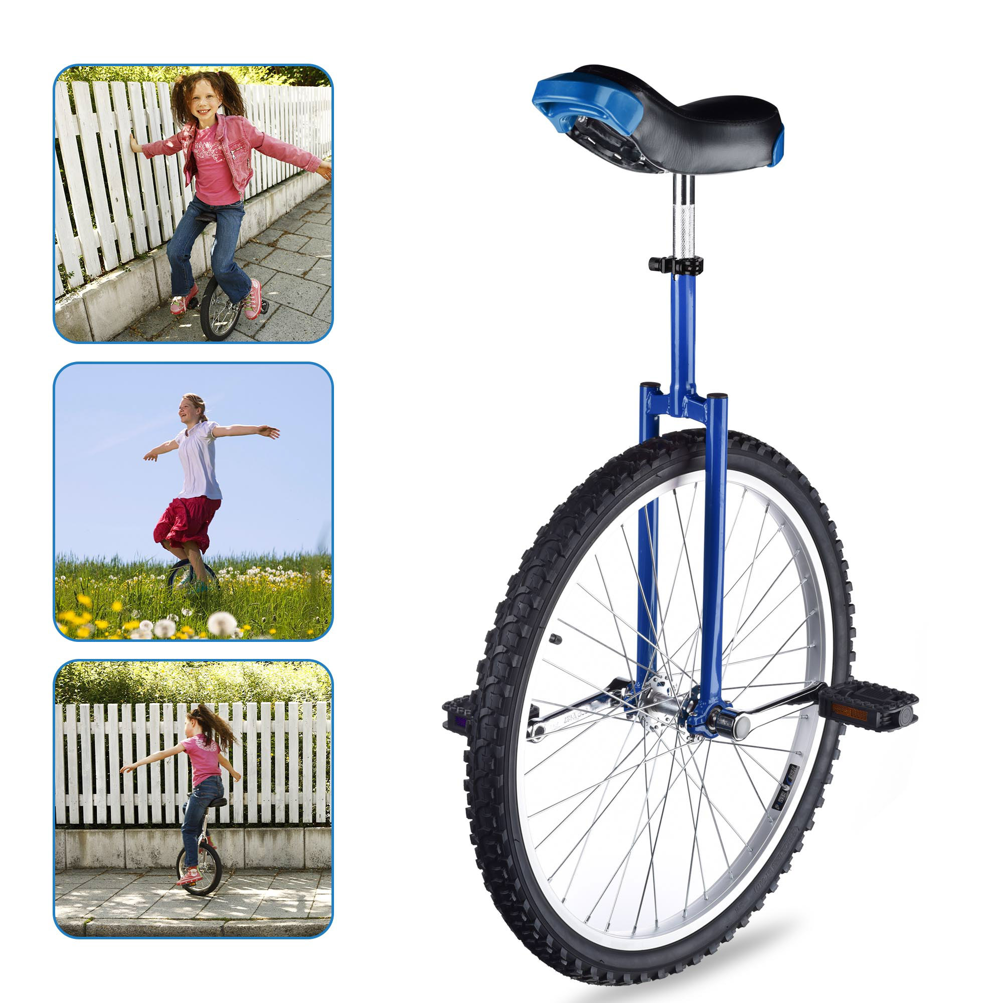 24" Wheel Unicycle features strong manganese steel frame and leakproof butyl tire for long time use and an adjustable seat for fitting users of different height. It is ideal for riding practice, balance training, fitness exercise, etc.