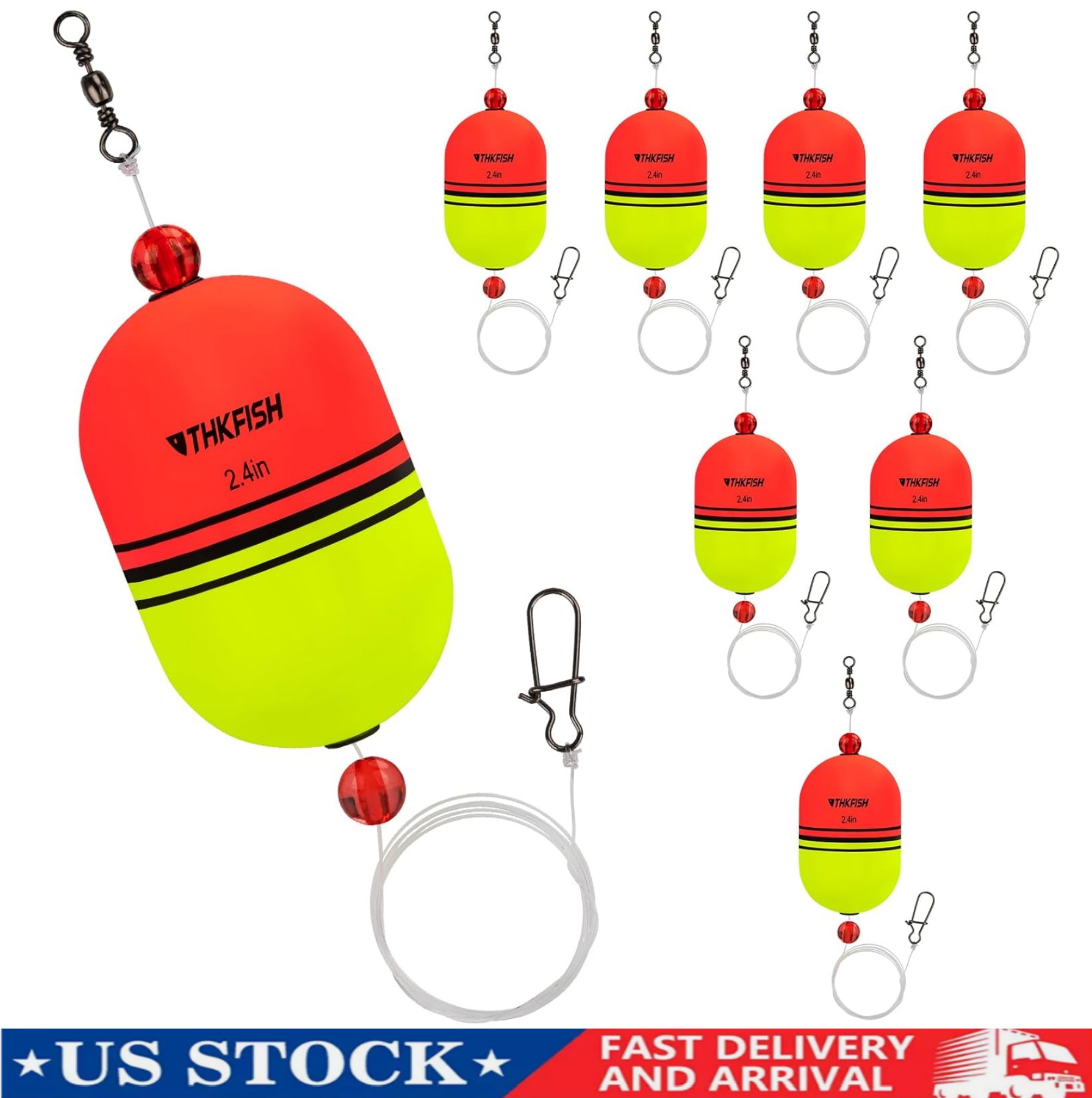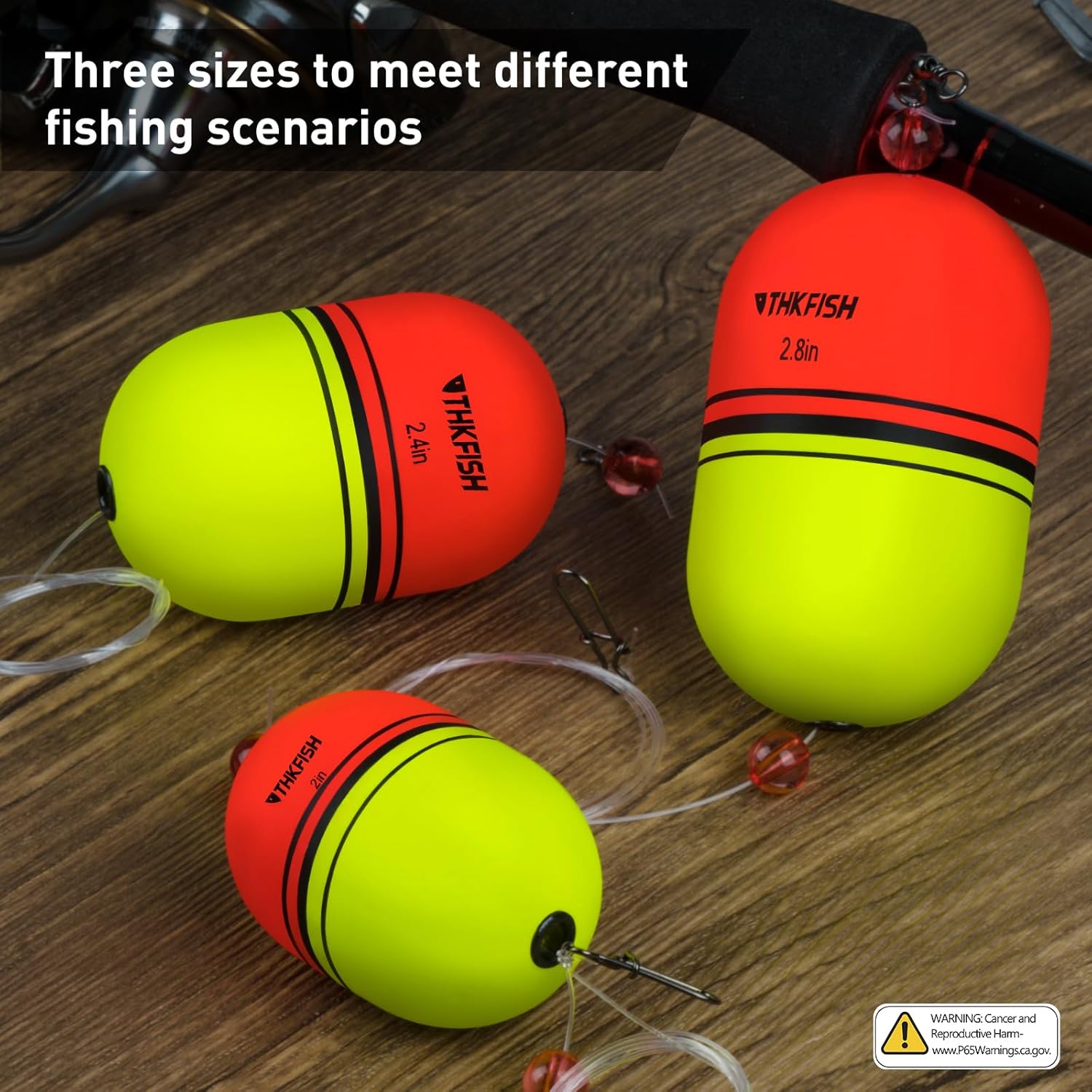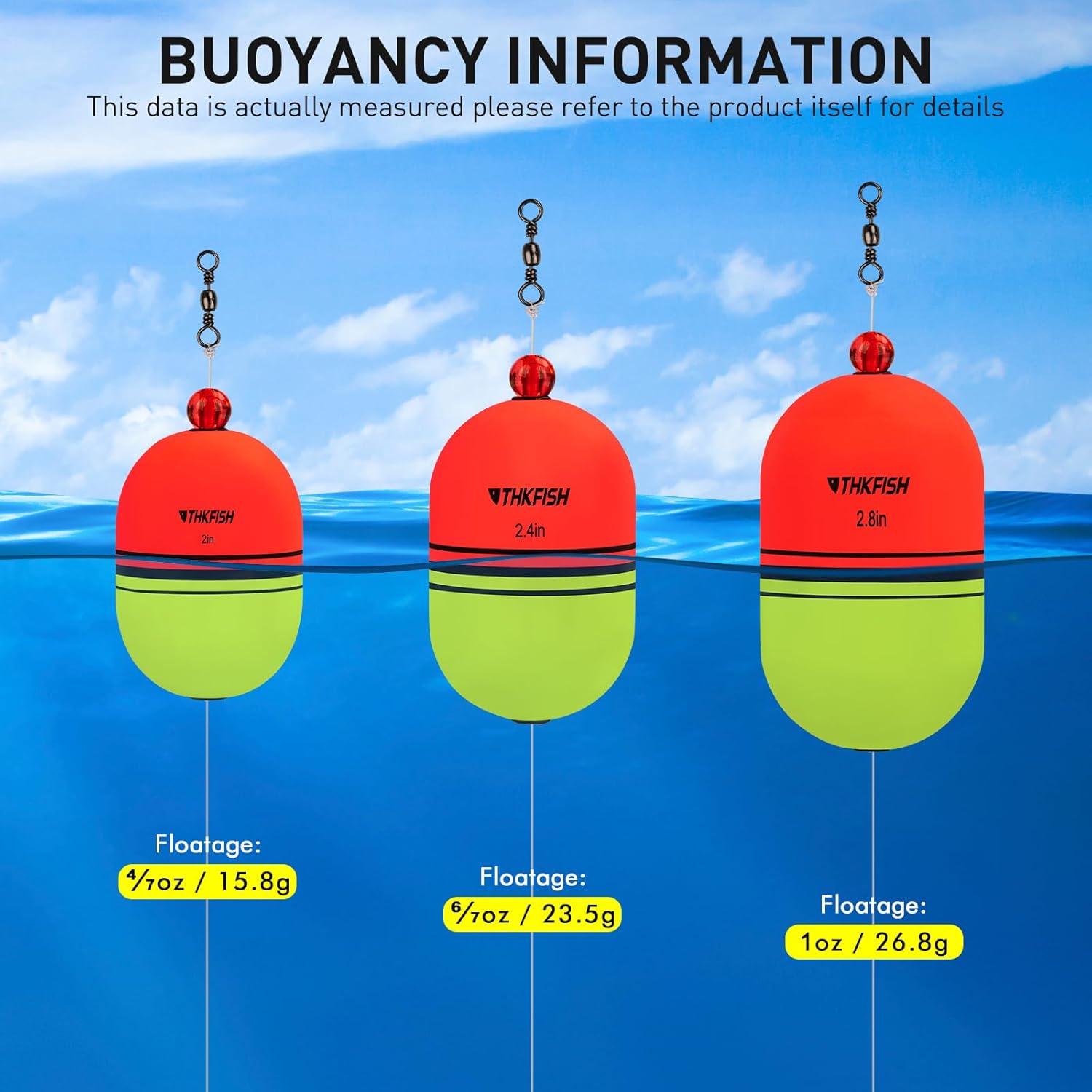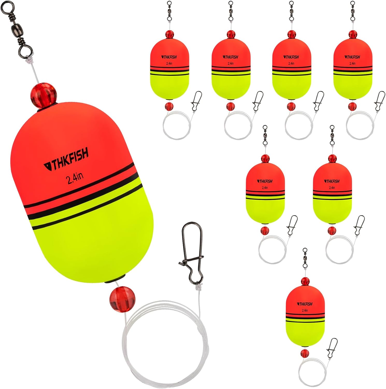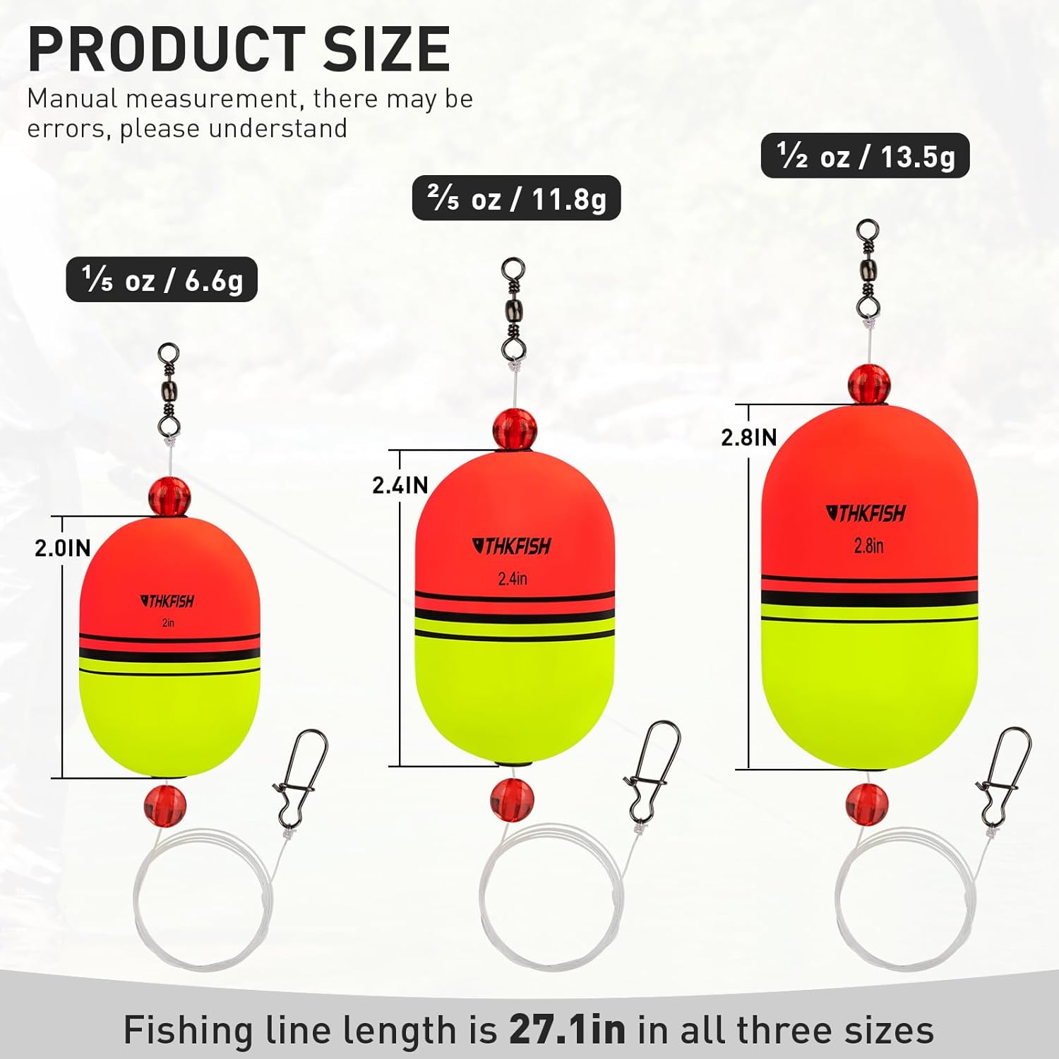 3 SIZES & 8 PIECES: Package includes 3 fishing floats and bobbers sizes to choose from: 1/5 oz (6.6g) * 2", 2/5 oz (11.8g) * 2.4", 1/2 oz (13.5g) * 2.8". Two colors: red and yellow.Nylon fishing line, 0.5mm diameter, a total length of 70cm, knot tension 14kg,30lb.If you have any questions, our customer service team will solve your problem within 24 hours