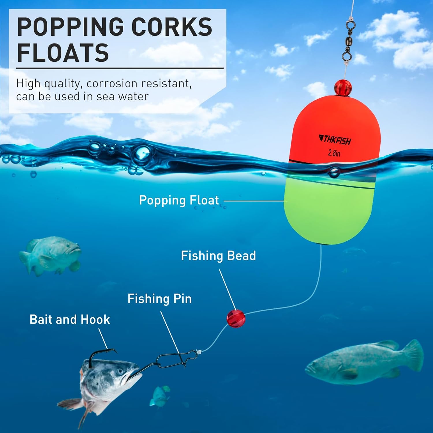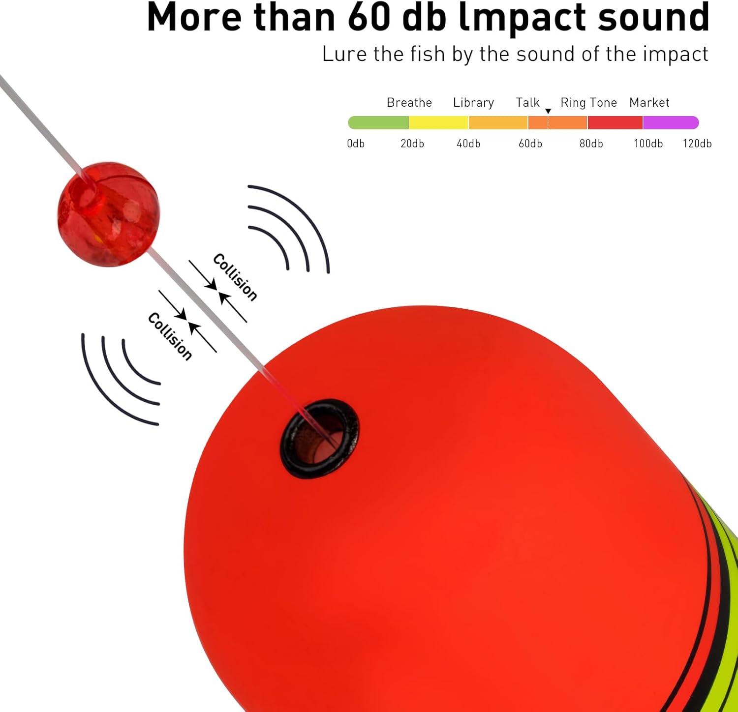 SOUNDING FLOATS TO ATTRACT MORE FISH: The fishing weights on the bottom of the cork jig pull the jig vertically into the water, and when you pull on the line or a fish pulls on the bait, the cork hits the bead and creates a "popping" sound that attracts fish. Additionally, the metal holes create a rattling sound when they come in collisions with the plastic beads. These sounds will attract fish to the bait, and you will attract more fish than anyone else, even in a noisy and dirty water.