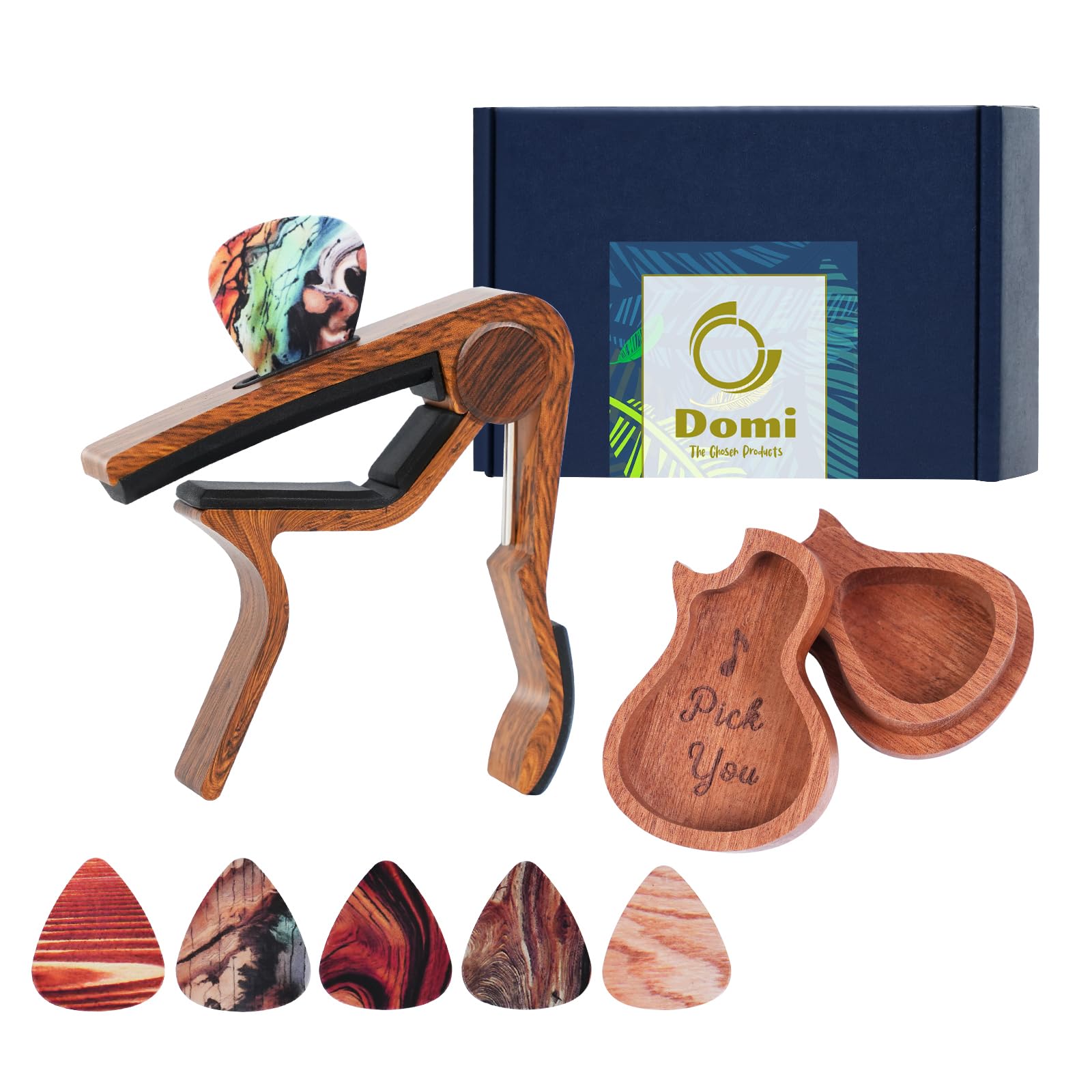 [GIFT BOX PACKAGING] The delicate blue box contains a guitar capo, a pick holder and six guitar picks. This set is a great choice for any guitar player, and the deep wood grain color scheme gives it a personal touch.