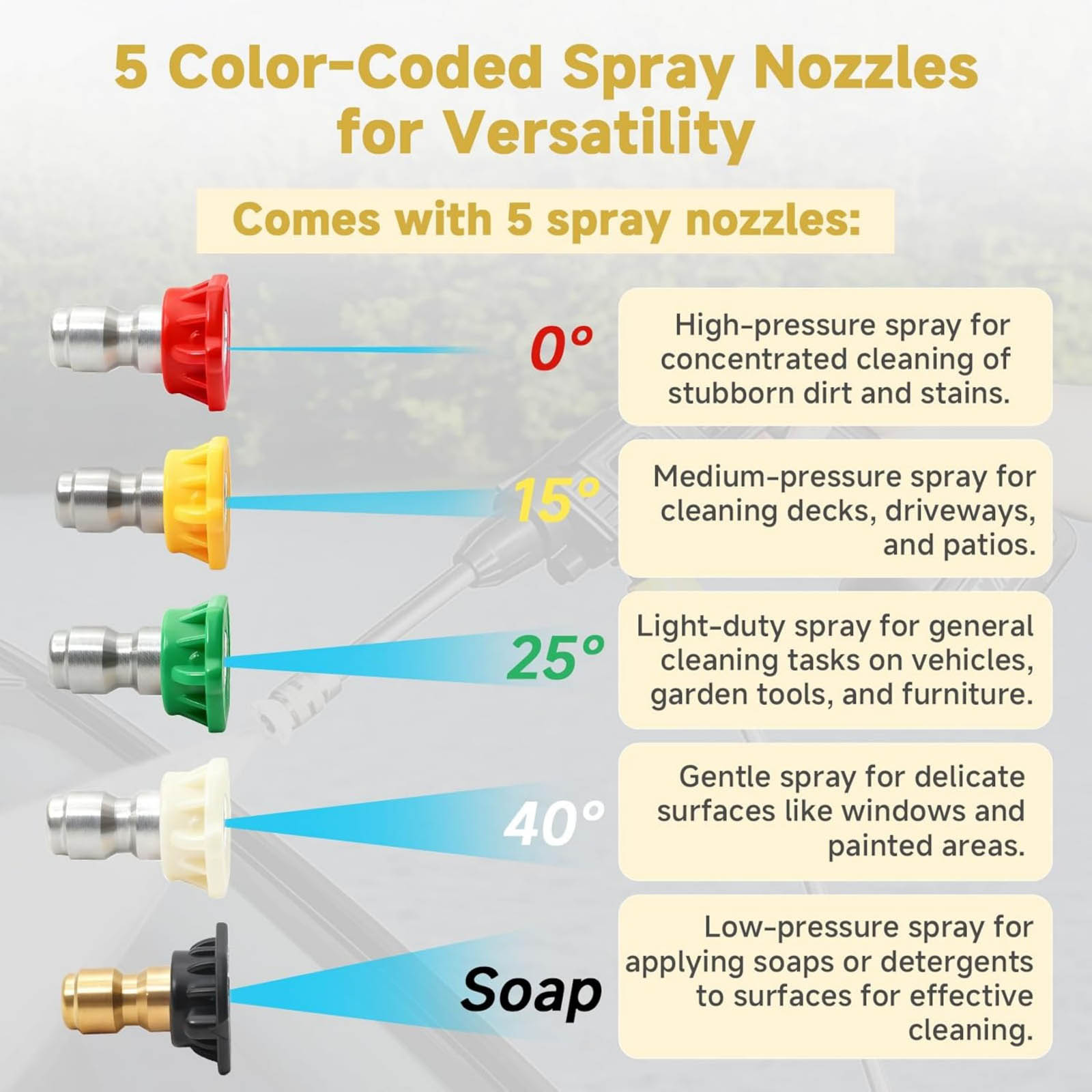 2. 5 Color-Coded Nozzles Included: Red (0°): High-Pressure Spray, Ideal For Cleaning Stubborn Stains And Hardened Dirt. Yellow (15°): Medium-Pressure Spray, Suitable For Cleaning Decks, Driveways, And Patios. Green (25°): Light Spray, Perfect For Cleaning Vehicles, Garden Tools, And Furniture. White (40°): Low-Pressure Spray, Suitable For Cleaning Delicate Surfaces Such As Windows And Painted Areas. Black (Soap): Low-Pressure Spray, Designed For Applying Soap Or Detergent For Deep Cleaning.