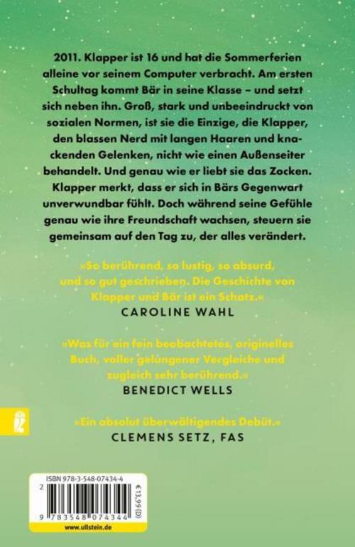 Sommer 2011. Klapper ist sechzehn und hat die Sommerferien alleine vor seinem Computer verbracht. Am ersten Schultag kommt plötzlich Bär in seine Klasse - und setzt sich neben ihn. Groß, stark und absolut unbeeindruckt von sozialen Normen, ist sie die Einzige, die Klapper, den blassen Nerd mit langen Haaren und knackenden Gelenken, nicht wie einen Außenseiter behandelt. Und genau wie er liebt sie das Zocken. Klapper merkt immer mehr, dass er sich in Bärs Gegenwart unverwundbar fühlt. Doch während seine Gefühle genau wie ihre Freundschaft wachsen, steuern sie gemeinsam auf den Tag zu, der alles ändert.