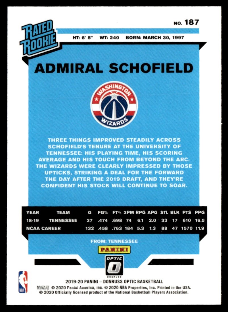 2019-20 Donruss Optic Rated Rookie Admiral Schofield Rookie Washington Wizards