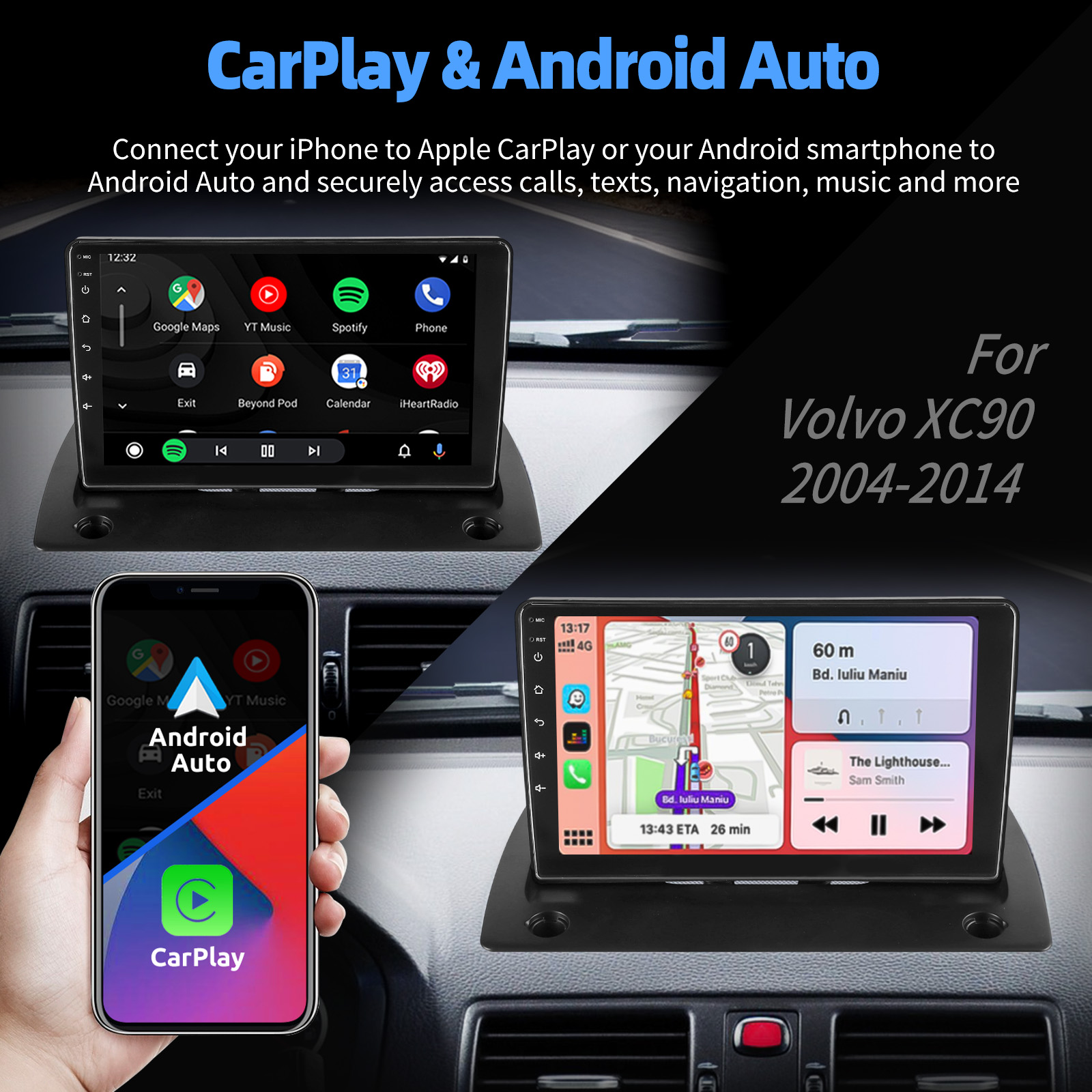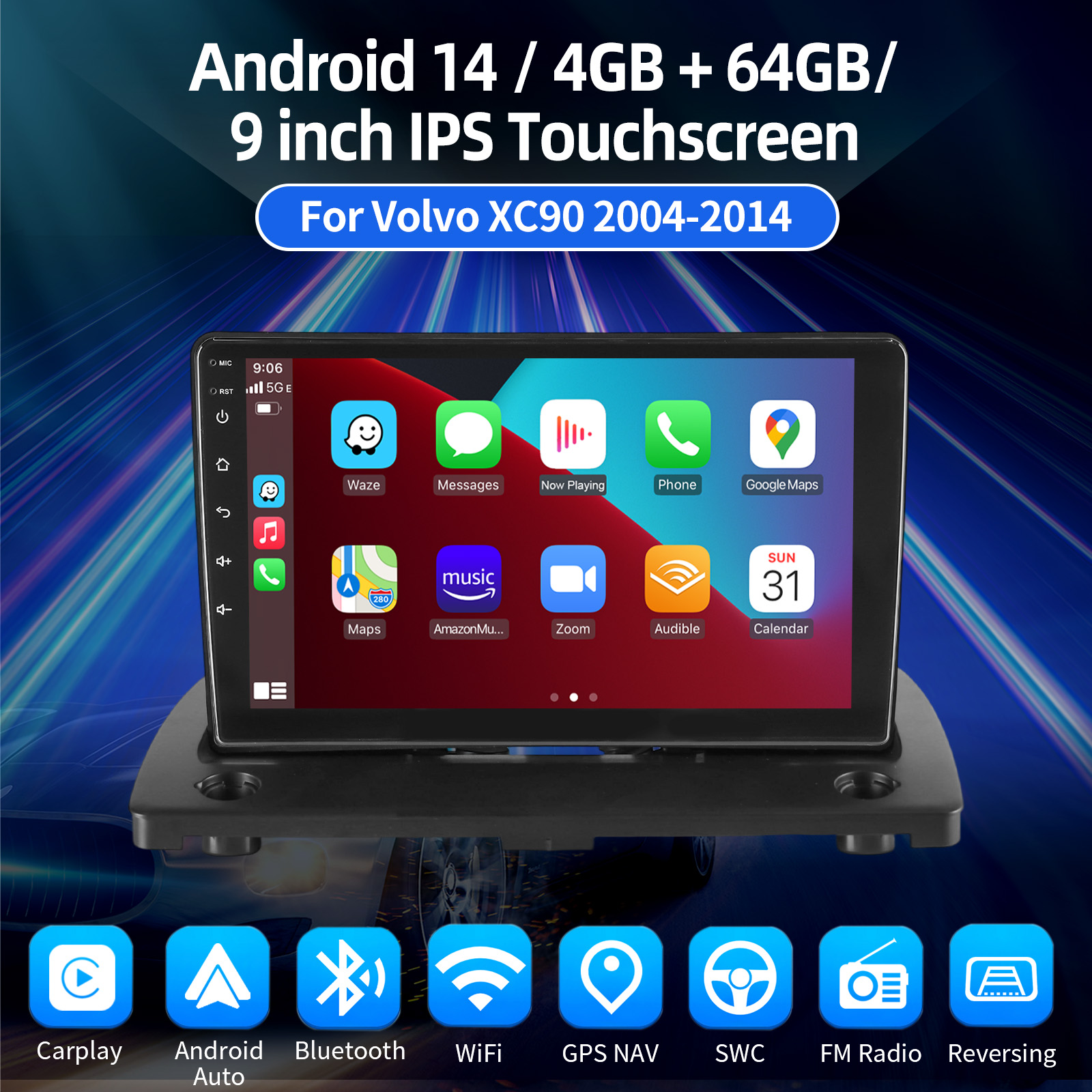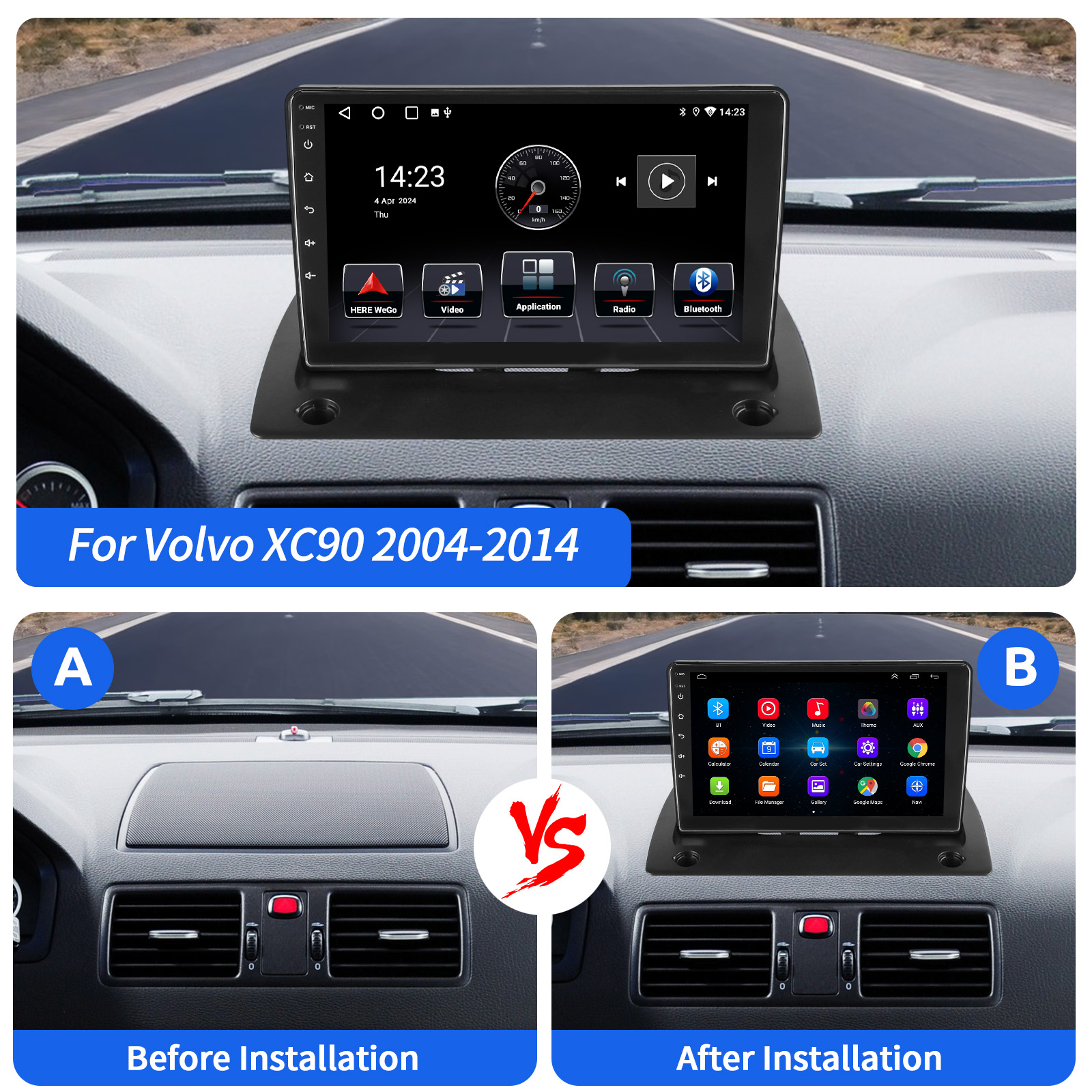 9 Inch Android 14 Car Radio For Volvo XC90 2004-2014(with AUX function): The Android car radio with 9" 1280*720 2.5D HD capacitive touch screen, 4GB RAM and 64GB ROM allows you to download your favorite apps and videos, so that driving will never be boring .No additional frame, no cable change, plug and play.