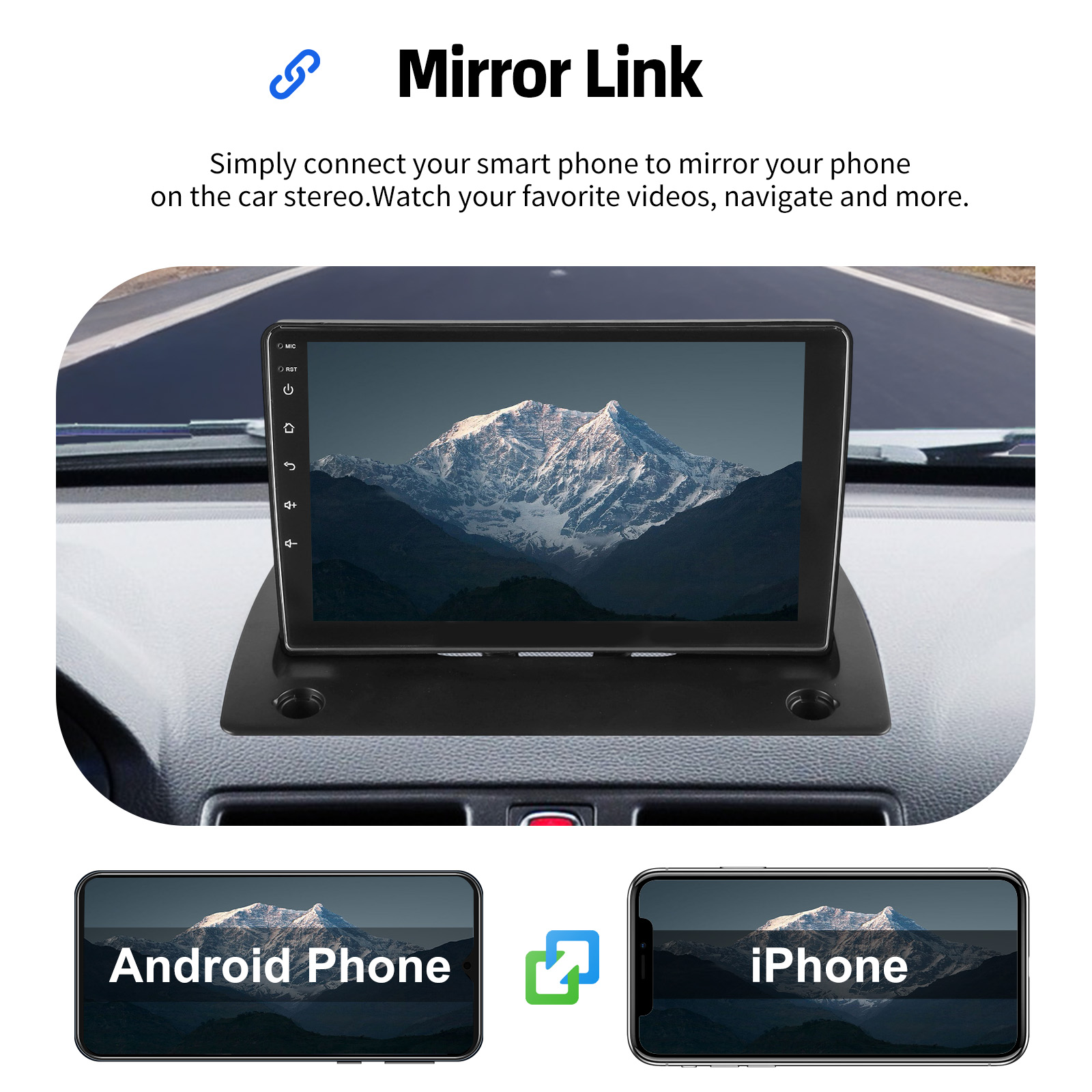 MIRROR LINK & APPLE CARPLAY & ANDROID AUTO: With this car radio, you can experience the amazing Mirror Link function, compatible with iOS and Android phones. You can mirror your smartphone screen to the car radio using apps like Google Maps, Spotify, Youtube, etc. Replace your cell phone with the car screen and turn your vehicle into a smart platform. Immerse yourself in a seamless and user-friendly infotainment experience with Apple CarPlay & Android Auto. Connect your iPhone to Apple CarPlay or your Android smartphone to Android Auto and securely access calls, texts, navigation, music and more. With intuitive operation via the touchscreen or voice control, you have all functions at your fingertips while you remain safely at the wheel. Use your favorite apps and stay connected at all times while keeping your eyes on the road. Turn your vehicle into an extended hub for your mobile devices and experience a new dimension in infotainment.