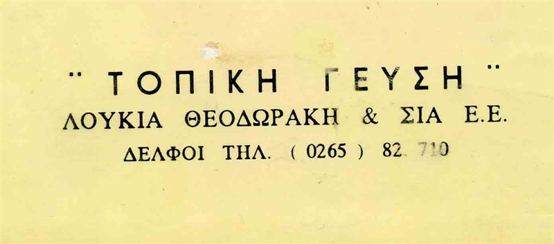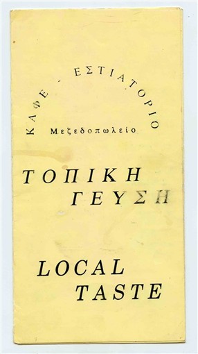 A 6 panel fold out menu in Greek and English. Local Taste Menu Athens Greece , Tau Omicron Pi Iota Kappa Eta Gamma Epsilon Upsilon Sigma Eta TOPIKE GEUSE. Measures about 5 1/2" x 10 1/2" when closed.