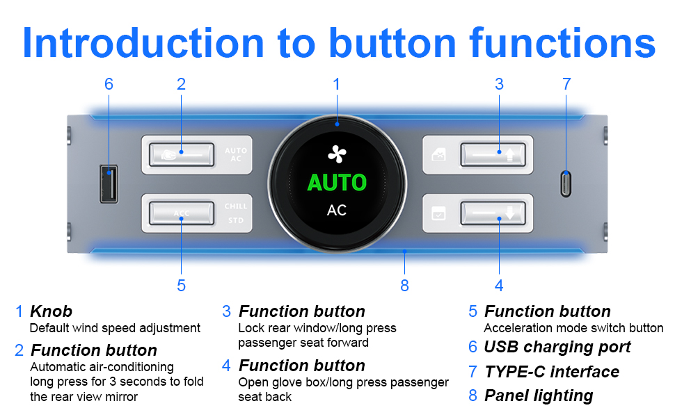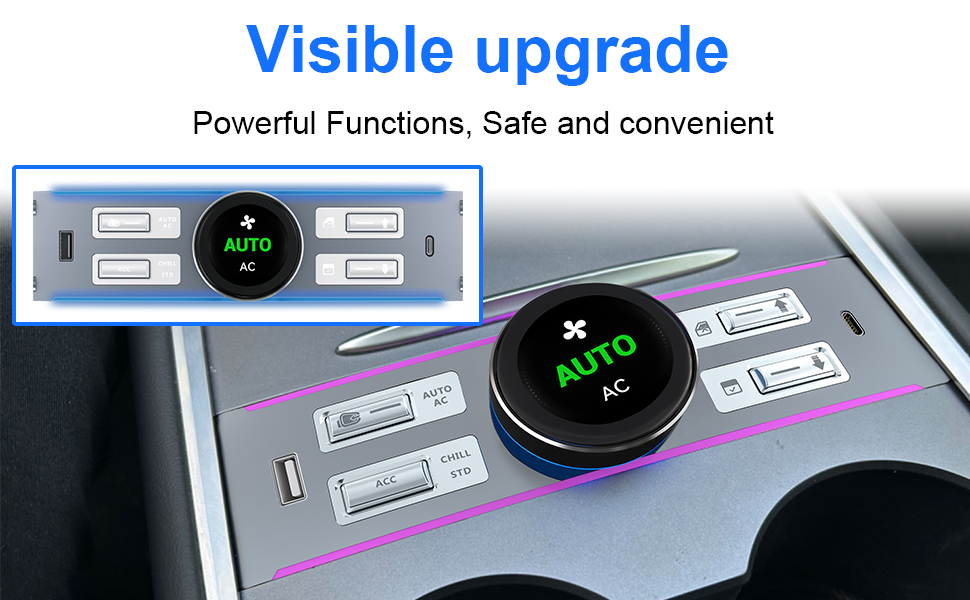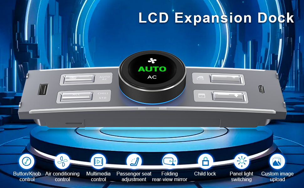 【Multi-function Smart Controller】Integrating a rotating button, four physical buttons, a 360*360 IPS pixel screen, a USB and Type C port, the central controller docking hub can control more than eight functions, including air conditioning temperature control, adjustment of the passenger seat, folding of the rearview mirrors, child lock control, and more.
