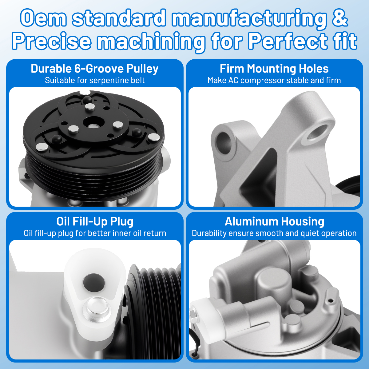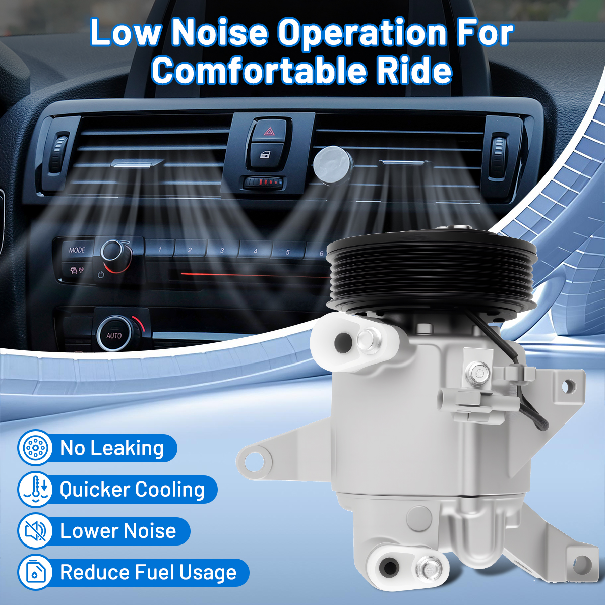 Our AC compressor kit works efficiently under low noise and tiny vibration to provide you a super cool trip. Driving at a stable speed will help reduce fuel consumption.