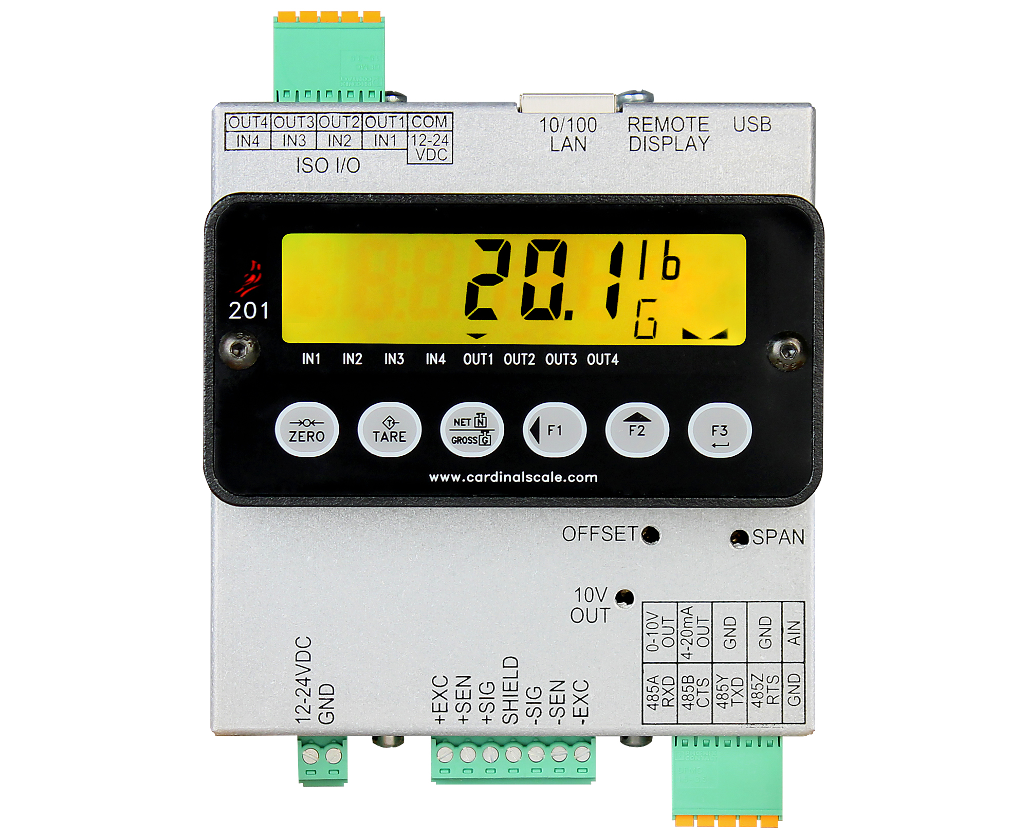 The 201 weight transmitter is a fast, accurate instrument for process control-based static and dynamic weighing applications capable of powering up to eight 350-ohm load cells and comes with a 35-mm DIN rail mounting bracket. The 201 transmitter features a 0.5-inch-high, six-digit, transflective LCD display with up to seven different colors and is viewable in all lighting levels from direct light to total darkness. A variety of mounting options and ColorZONE control options make it ideal for quick visual verification of weight status. The 201 offers sample rates of up to 200 samples per second and standard communication protocols include serial interface RS232/RS485, mini USB-B, Analog (0-10V or 4-20mA), Ethernet TCP/IP, EIP, and Modbus TCP, making it easy to connect to a PC, PLC, and other smart devices. NTEP, Measurement Canada, CE, and UL.