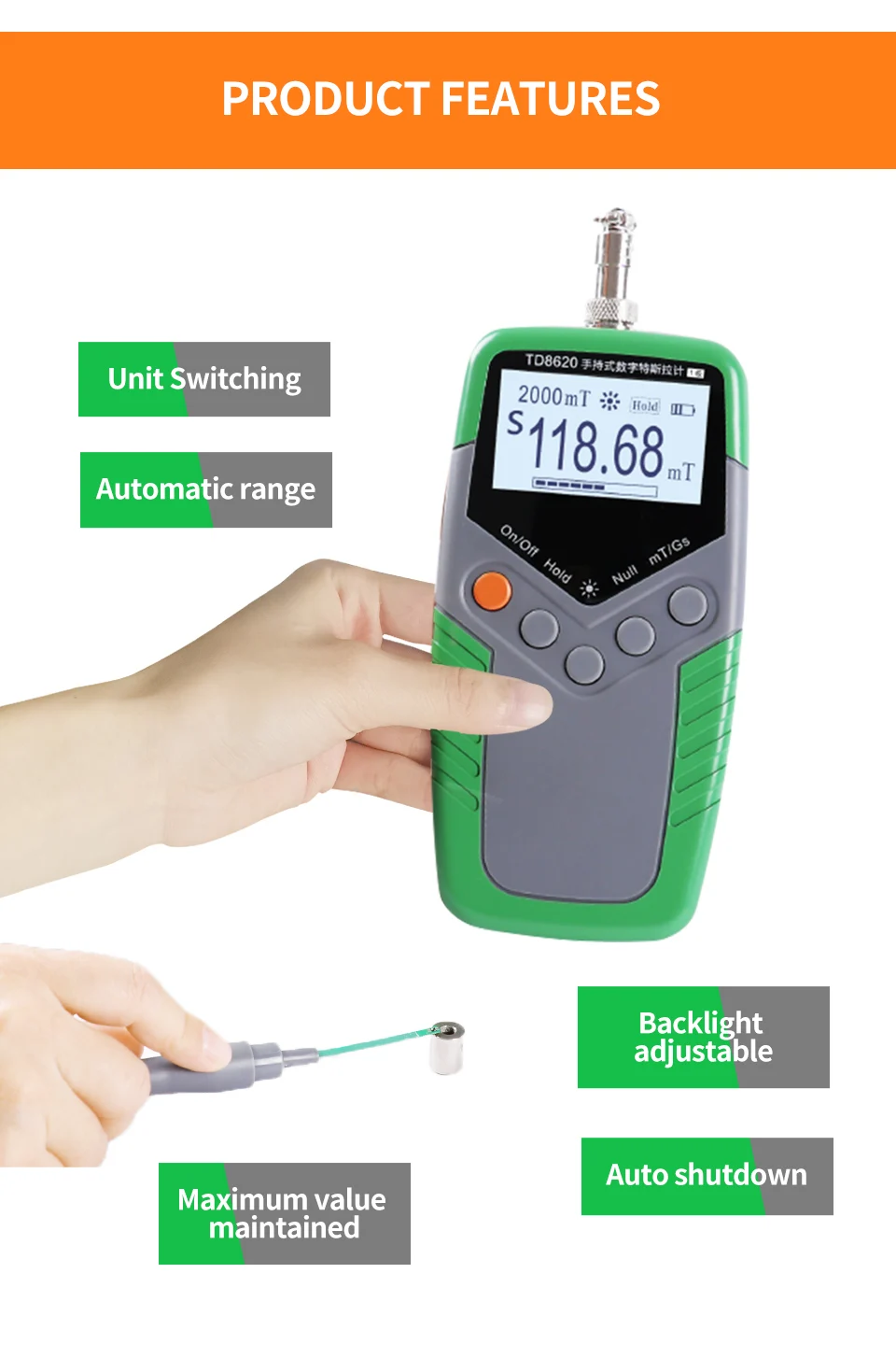 3.It has the advantages of high sensitivity, stable reading, low power consumption , and light weight. The measurement range is 0-2000 Mt, and the basic accuracy is ±1%. It has the characteristics of automatic zero, automatic measurement range, keeping of maximum / minimum values, etc.