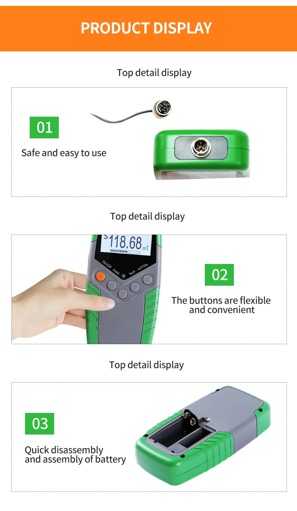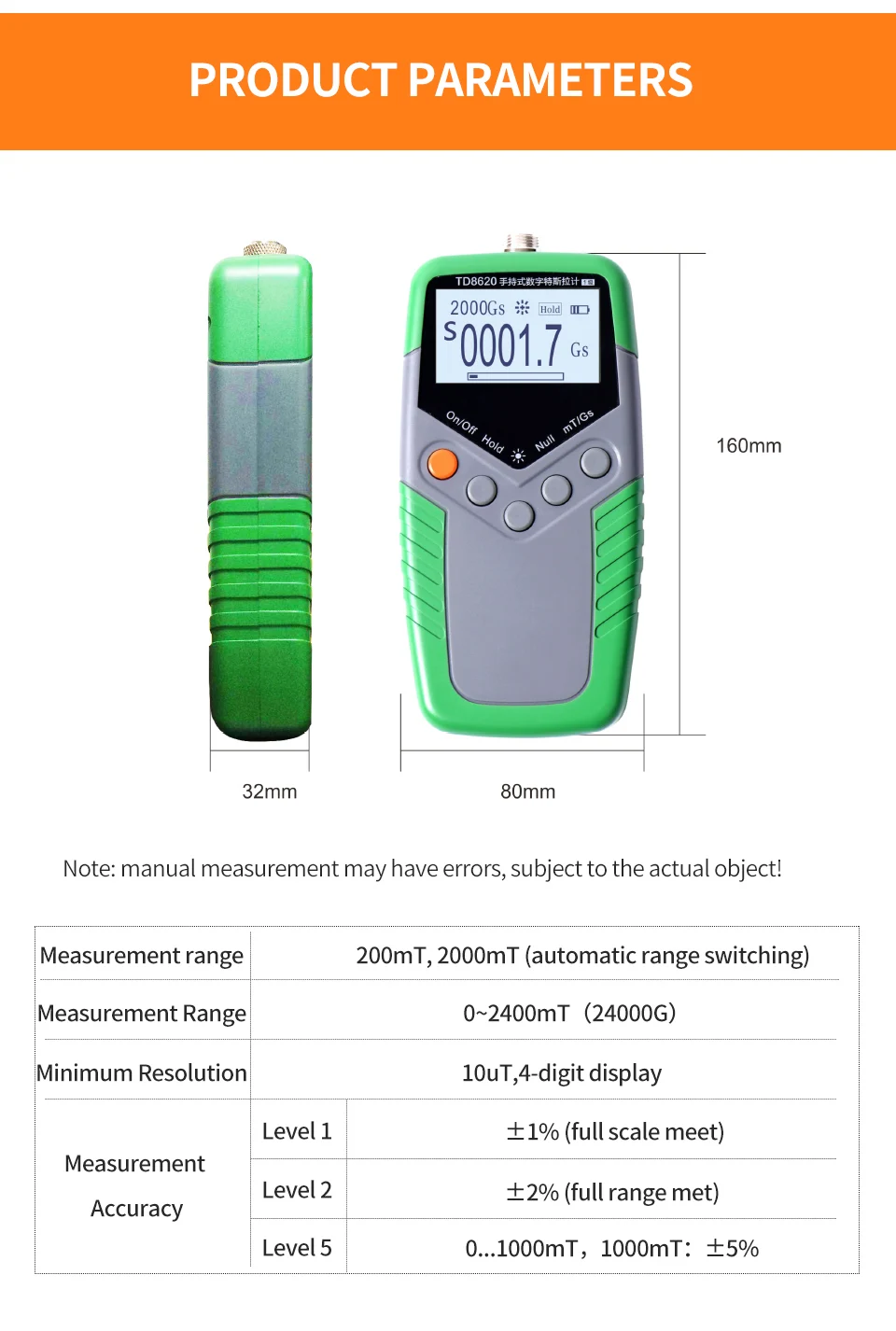 2.The value can be switched by one button: mT (mite) or G (gauss).