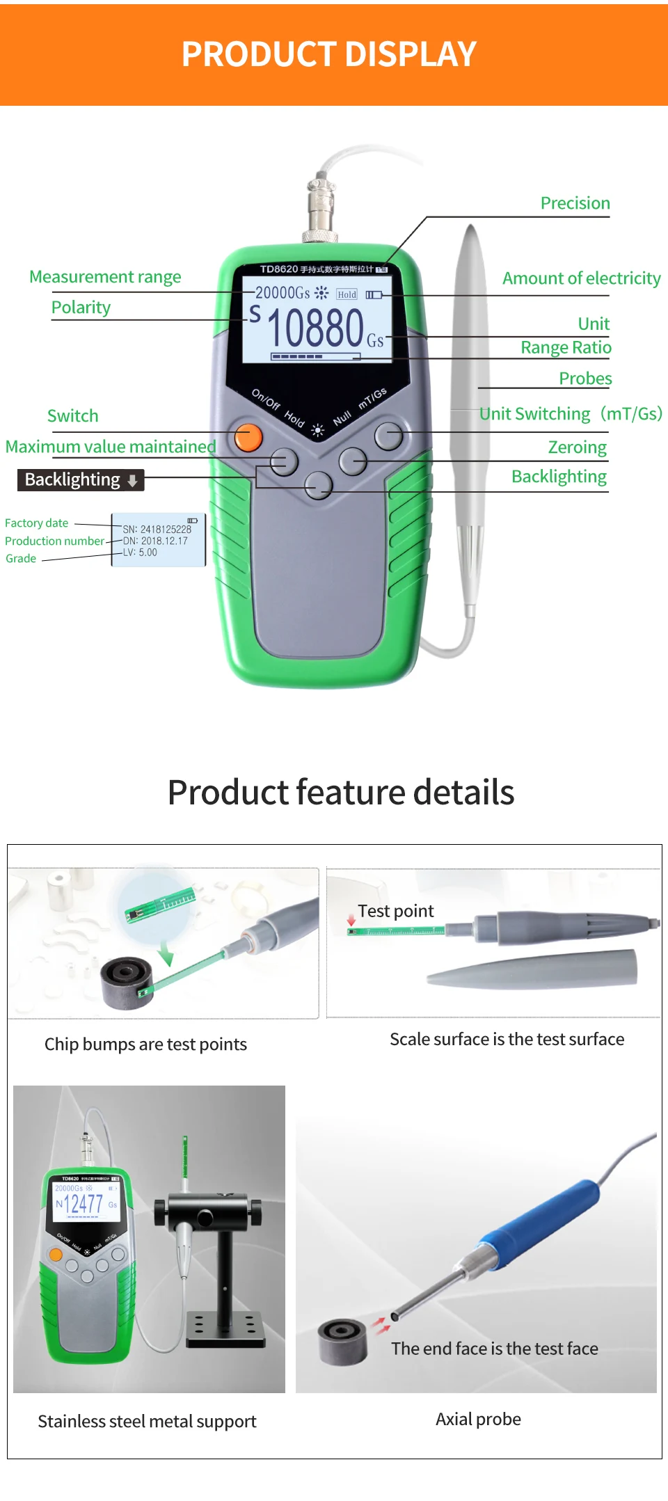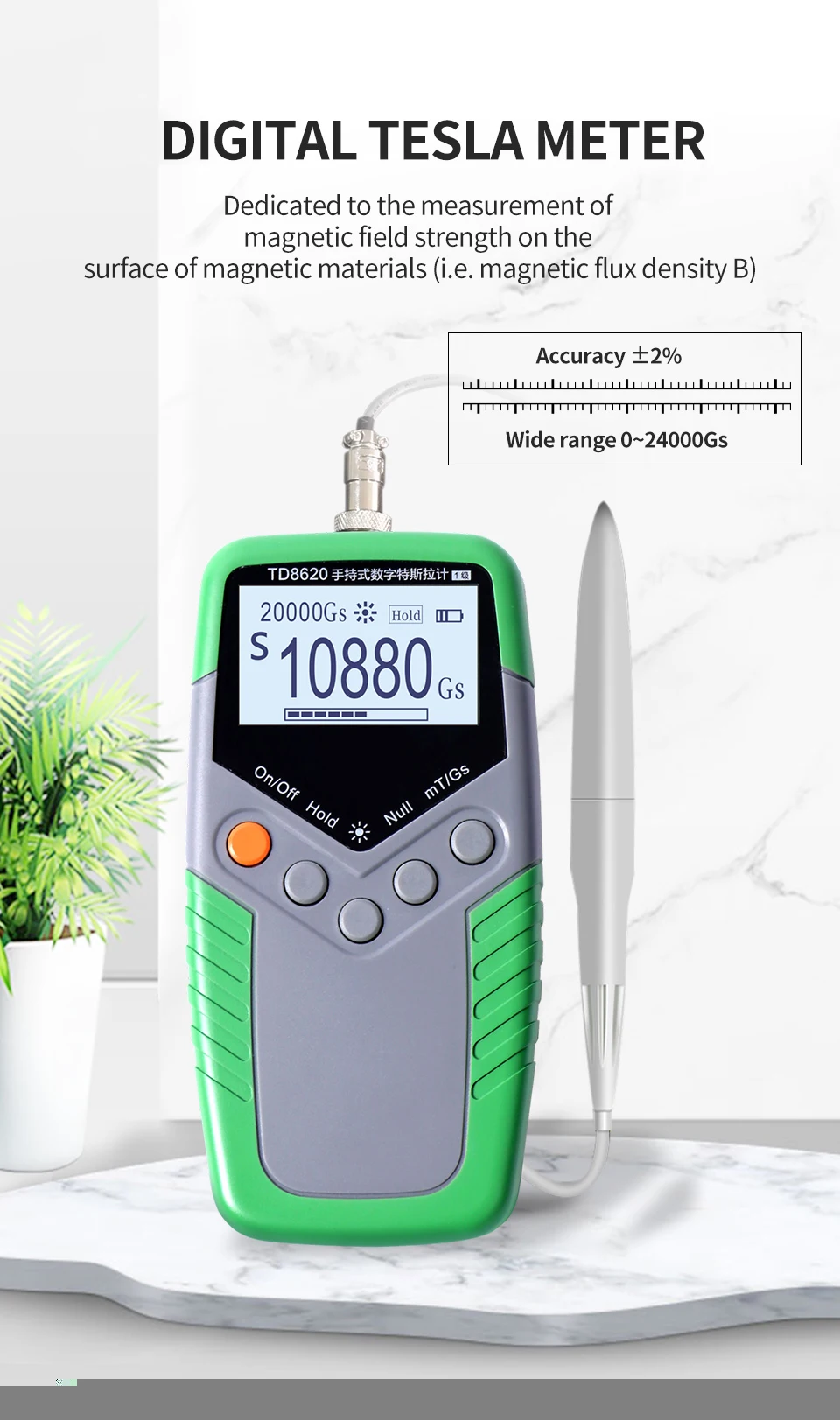 1.Dedicated to measuring the surface flux density of permanent magnet materials B, range: 0 to 2400 mT