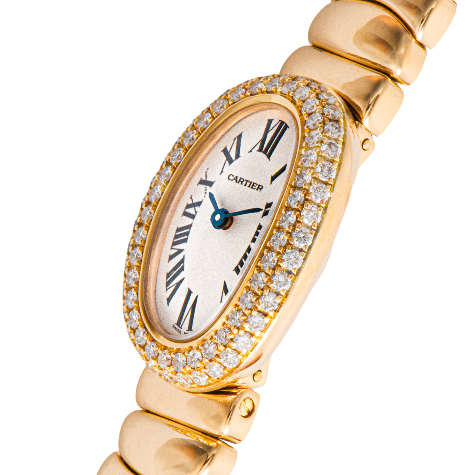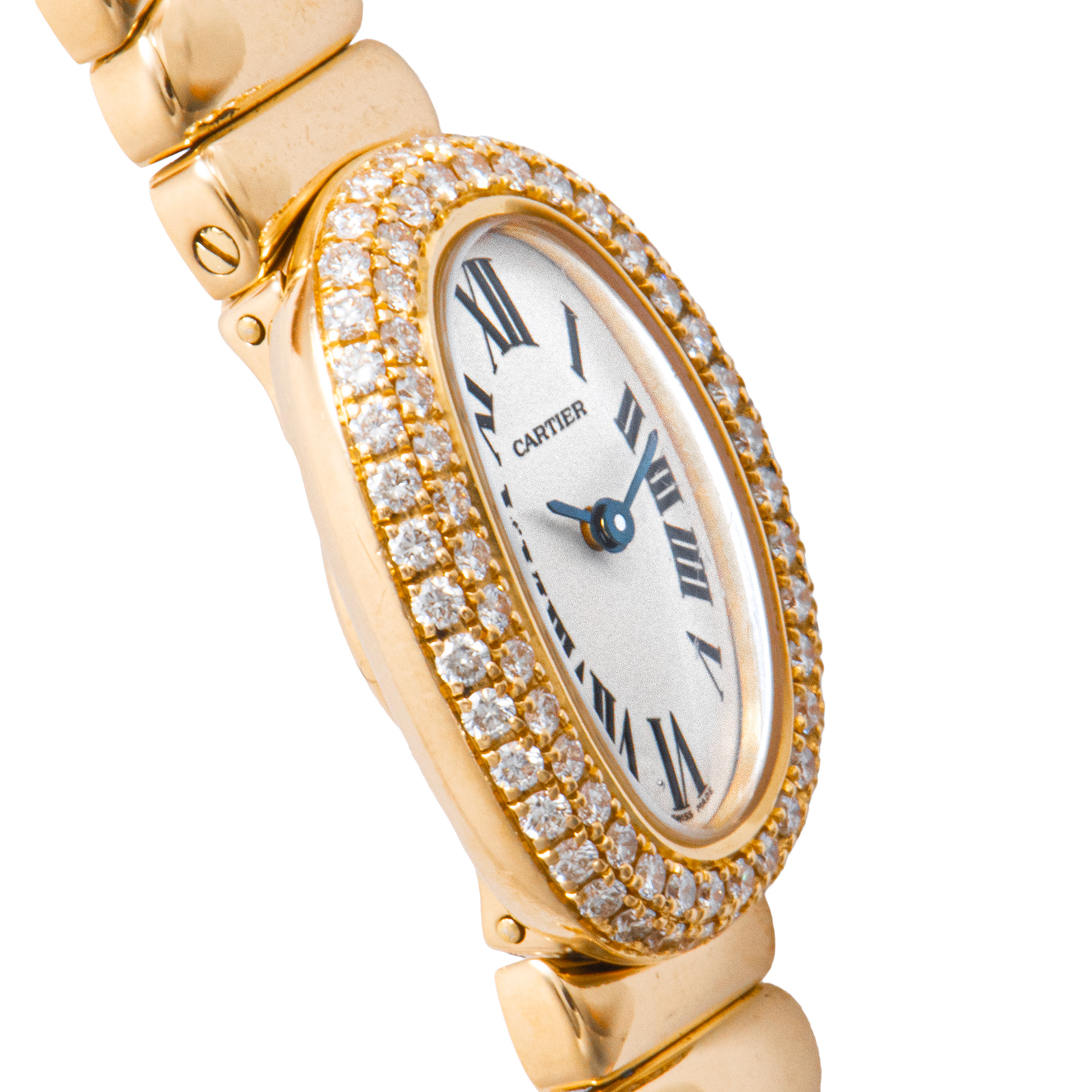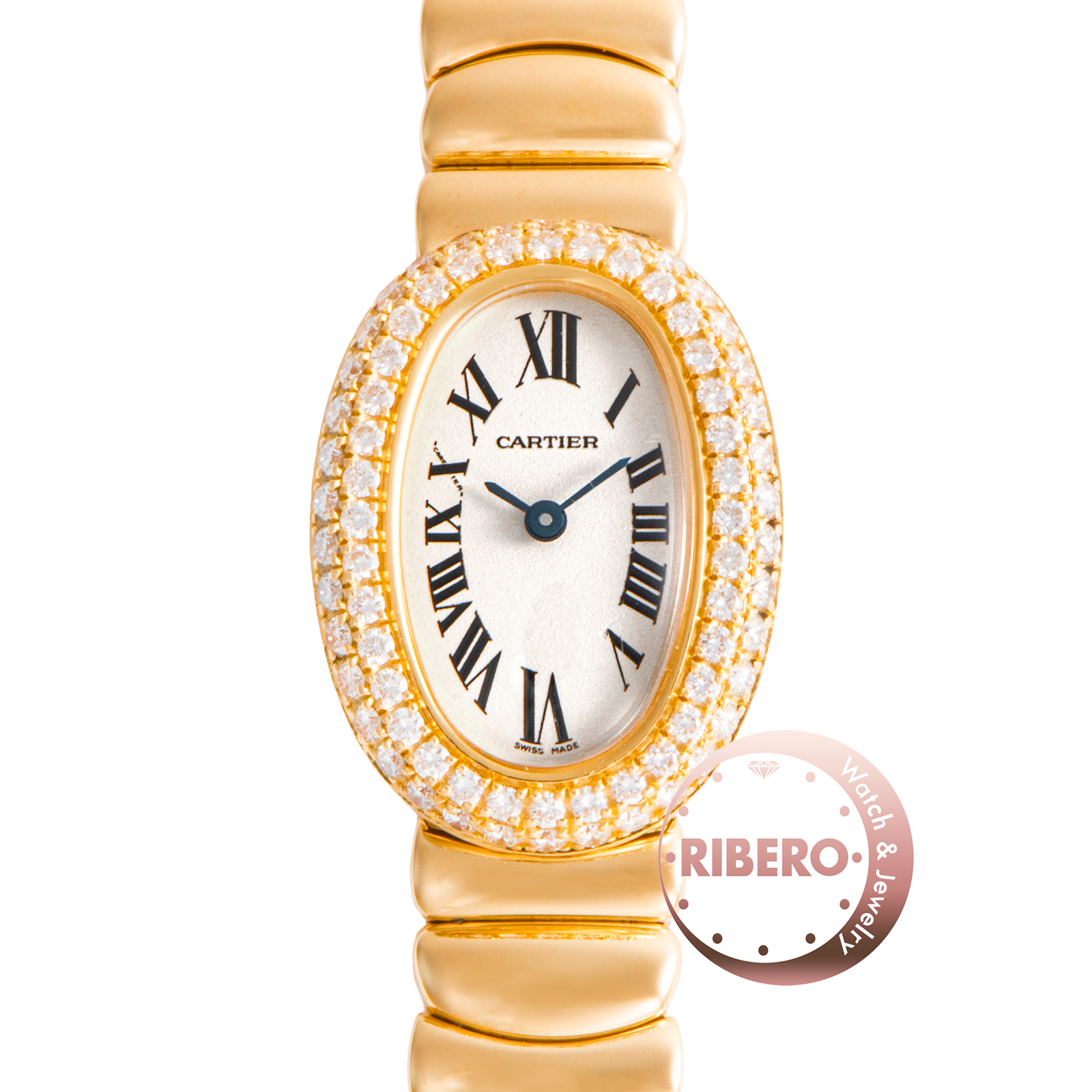 | item Description | The Cartier Mini Baignoire WB5094W1 is a dazzling timepiece featuring a mini 18K yellow gold case adorned with a double diamond bezel. The Roman numerals and blue hands stand out beautifully against the white dial, adding a touch of classic elegance. This quartz watch is easy to use and is now a rare model as it is no longer in production. |