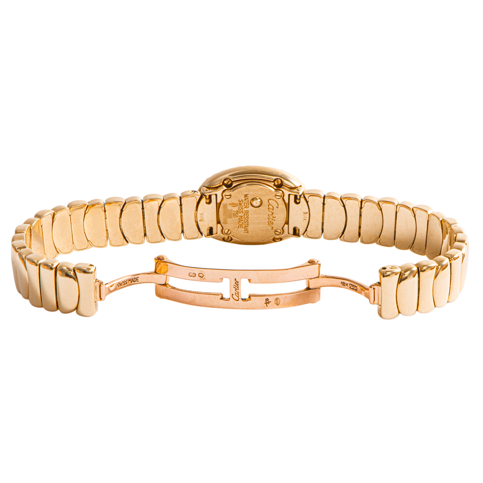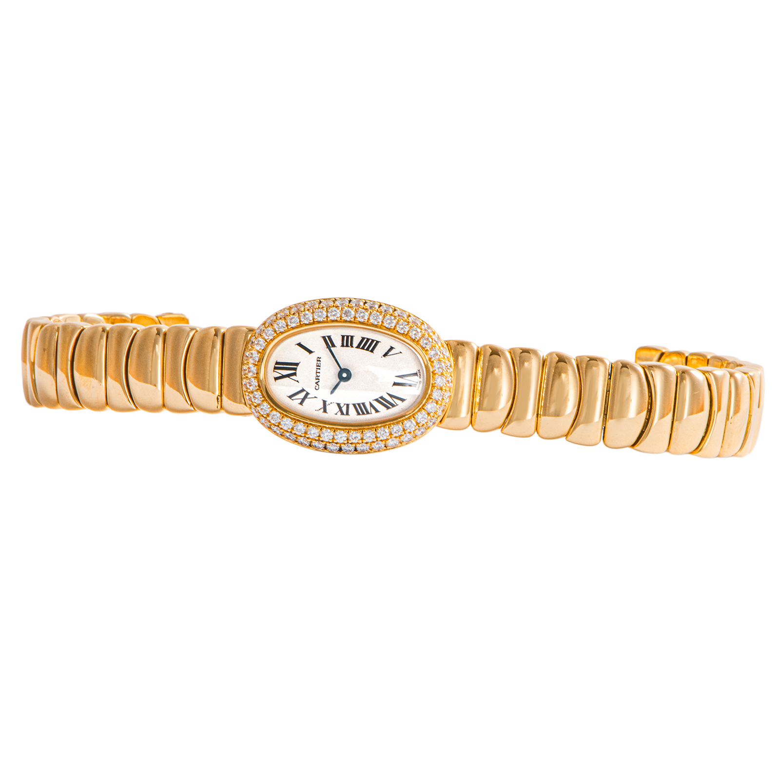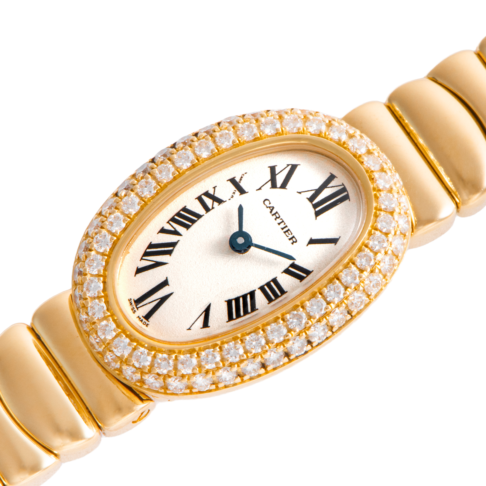 | item Description | The Cartier Mini Baignoire WB5094W1 is a dazzling timepiece featuring a mini 18K yellow gold case adorned with a double diamond bezel. The Roman numerals and blue hands stand out beautifully against the white dial, adding a touch of classic elegance. This quartz watch is easy to use and is now a rare model as it is no longer in production. |