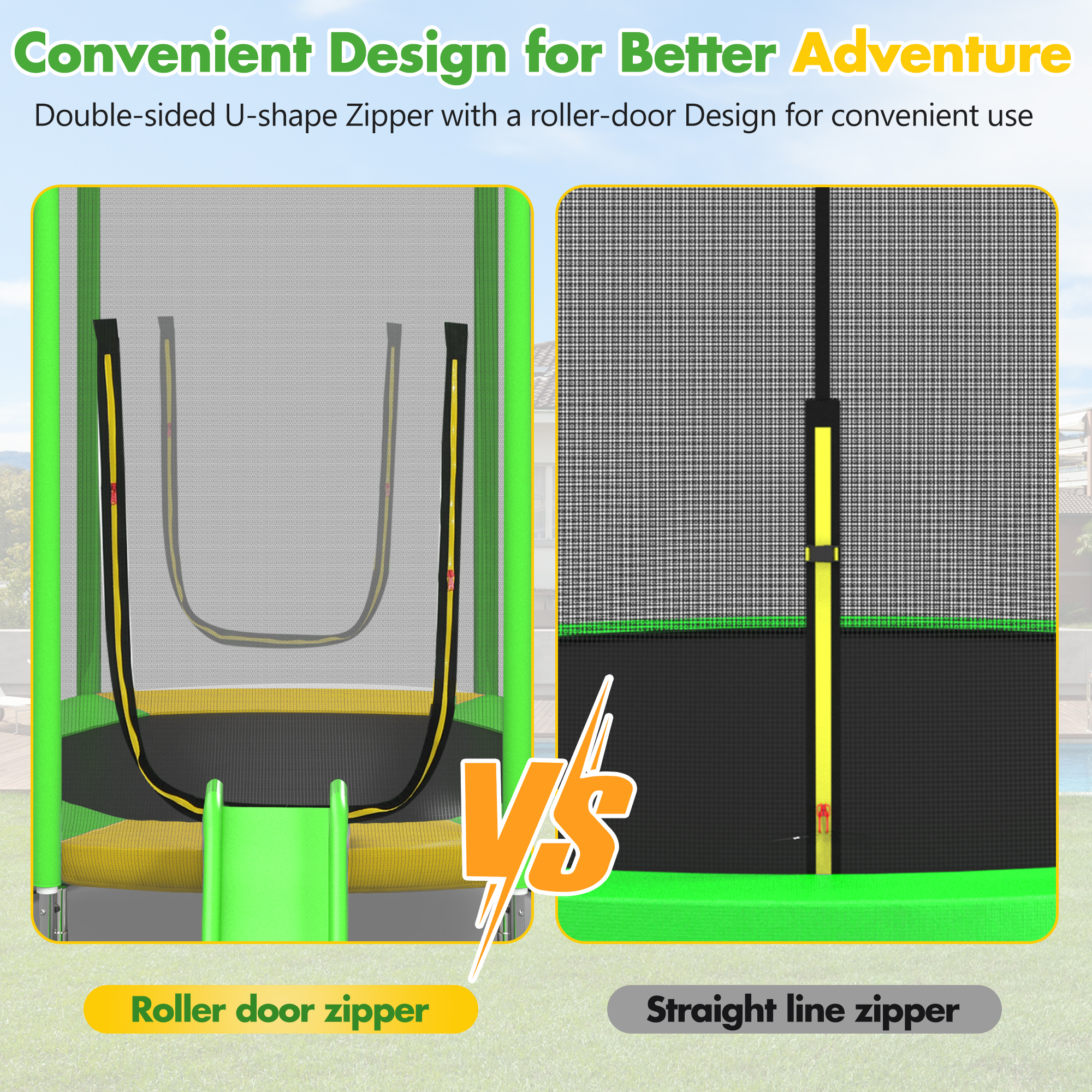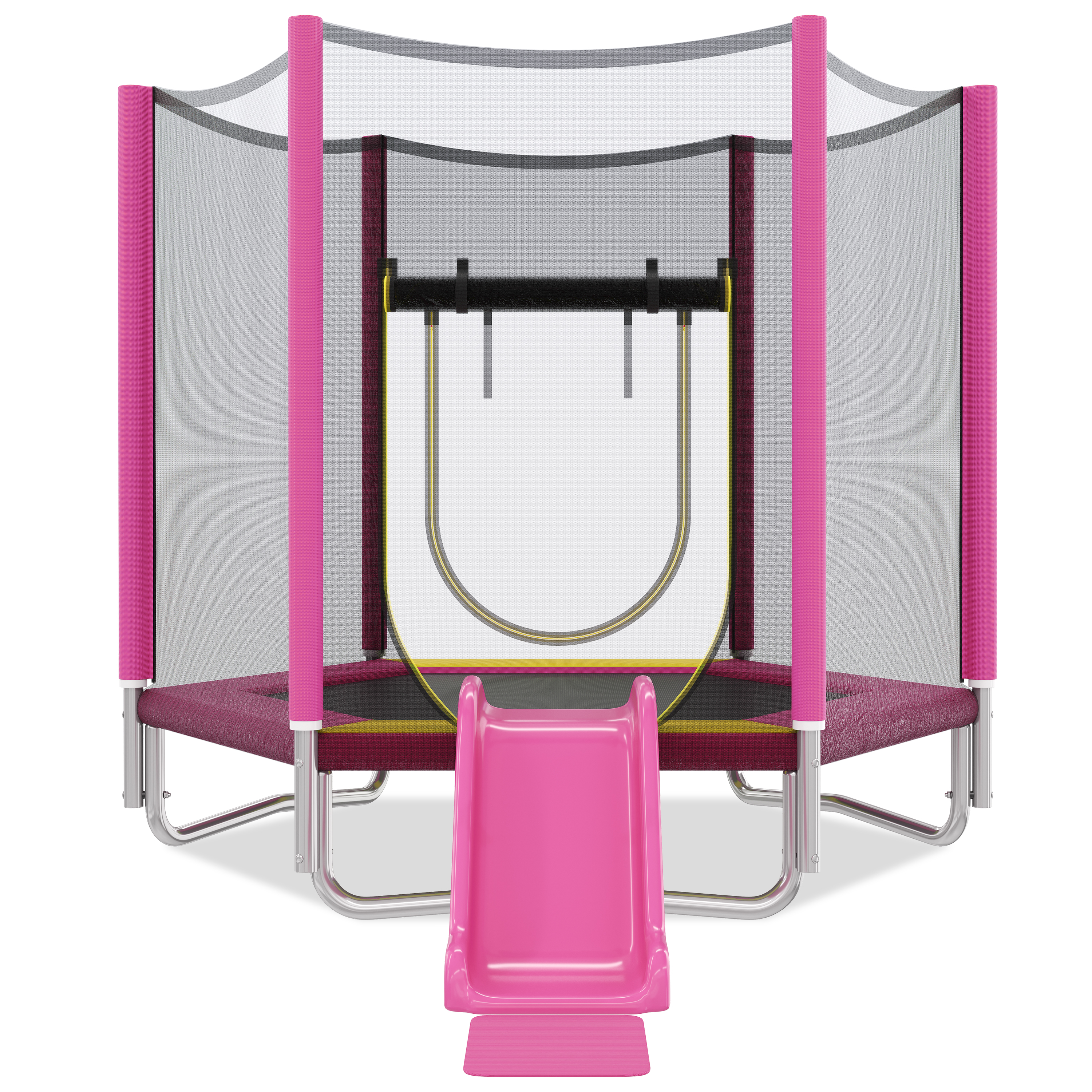This vibrant trampoline with safety net is a perfect addition to any backyard, offering endless fun for kids. They can jump, roll, and slide down with joy, while parents enjoy peace of mind thanks to its sturdy construction and UV-protected safety features. Ideal for outdoor family activities, it's built to last and withstand all weather conditions, ensuring a safe and exciting play area for children to release their energy.