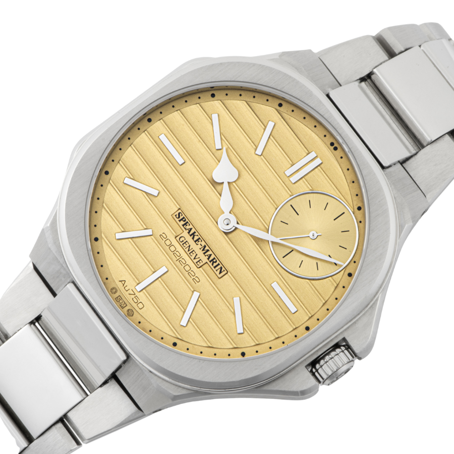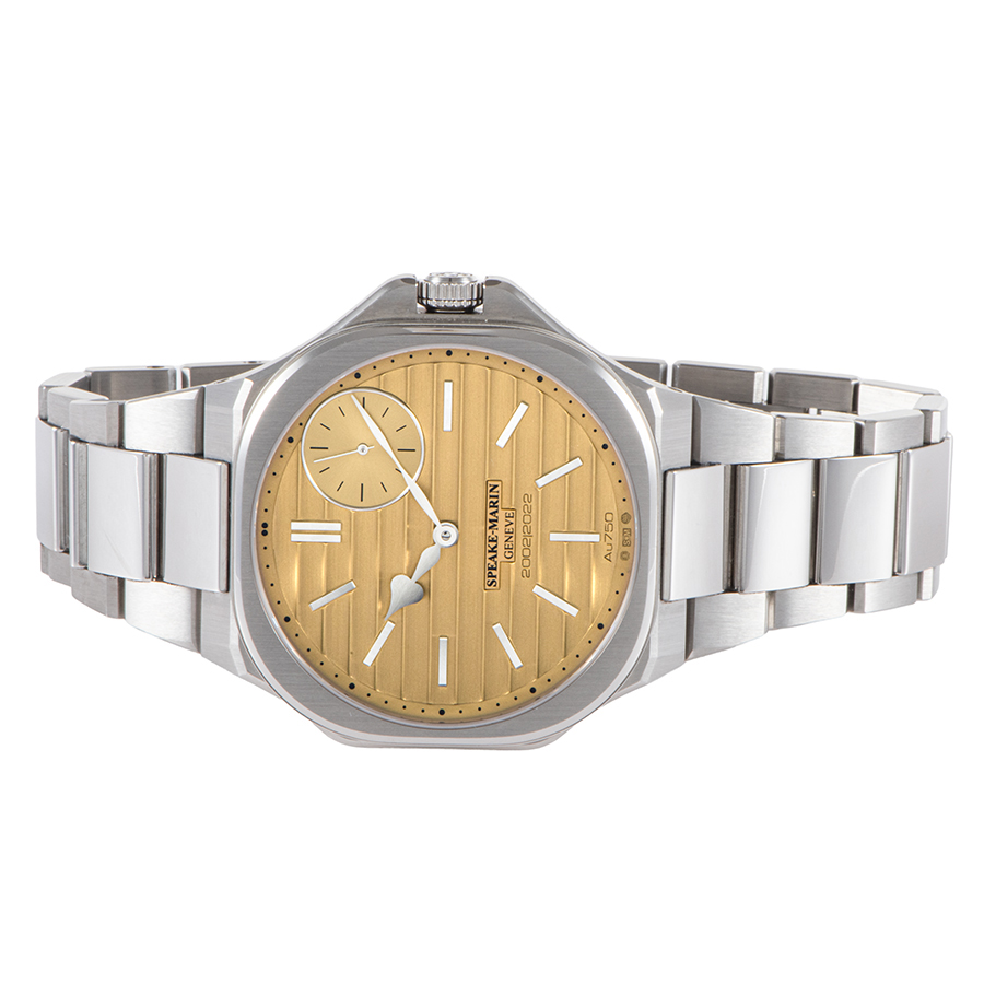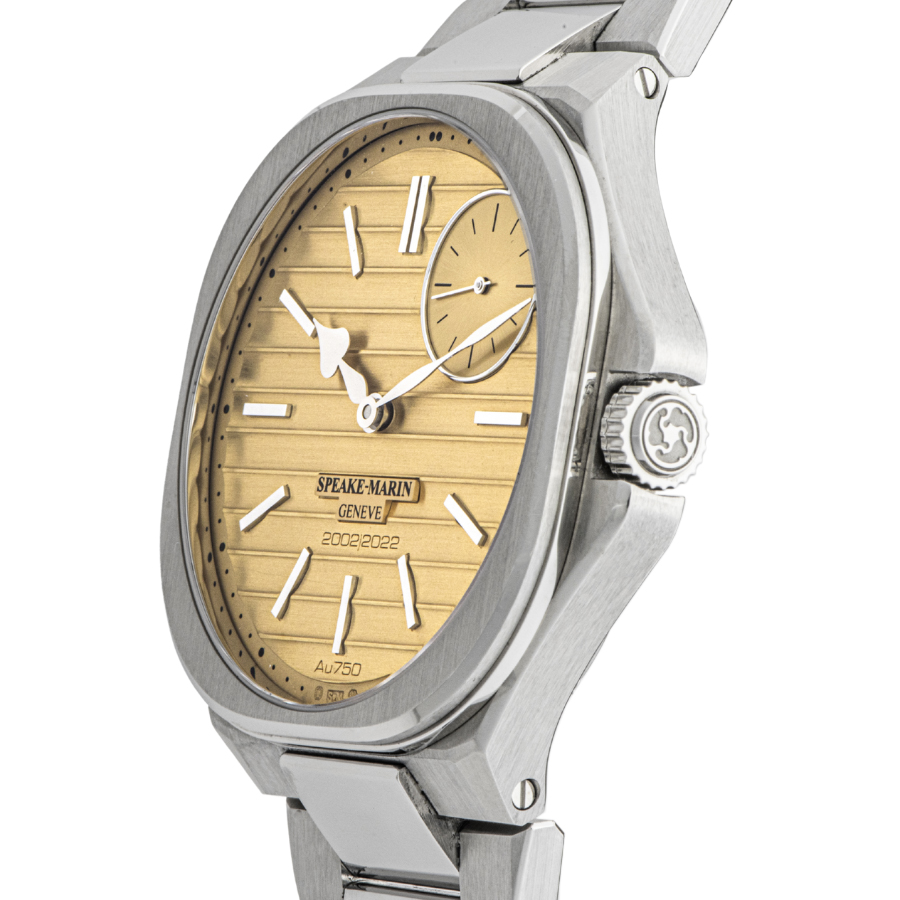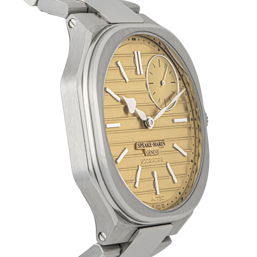 | item Description | The dial of the limited edition "Ripples" model is made of 18K yellow gold with a ripple finish (satin brushed finish). Below the index at the 6 o'clock position, "AU750" is engraved to indicate 18K yellow gold, and below the brand logo, the numbers "2002 2022" are engraved to commemorate the 20th anniversary. |