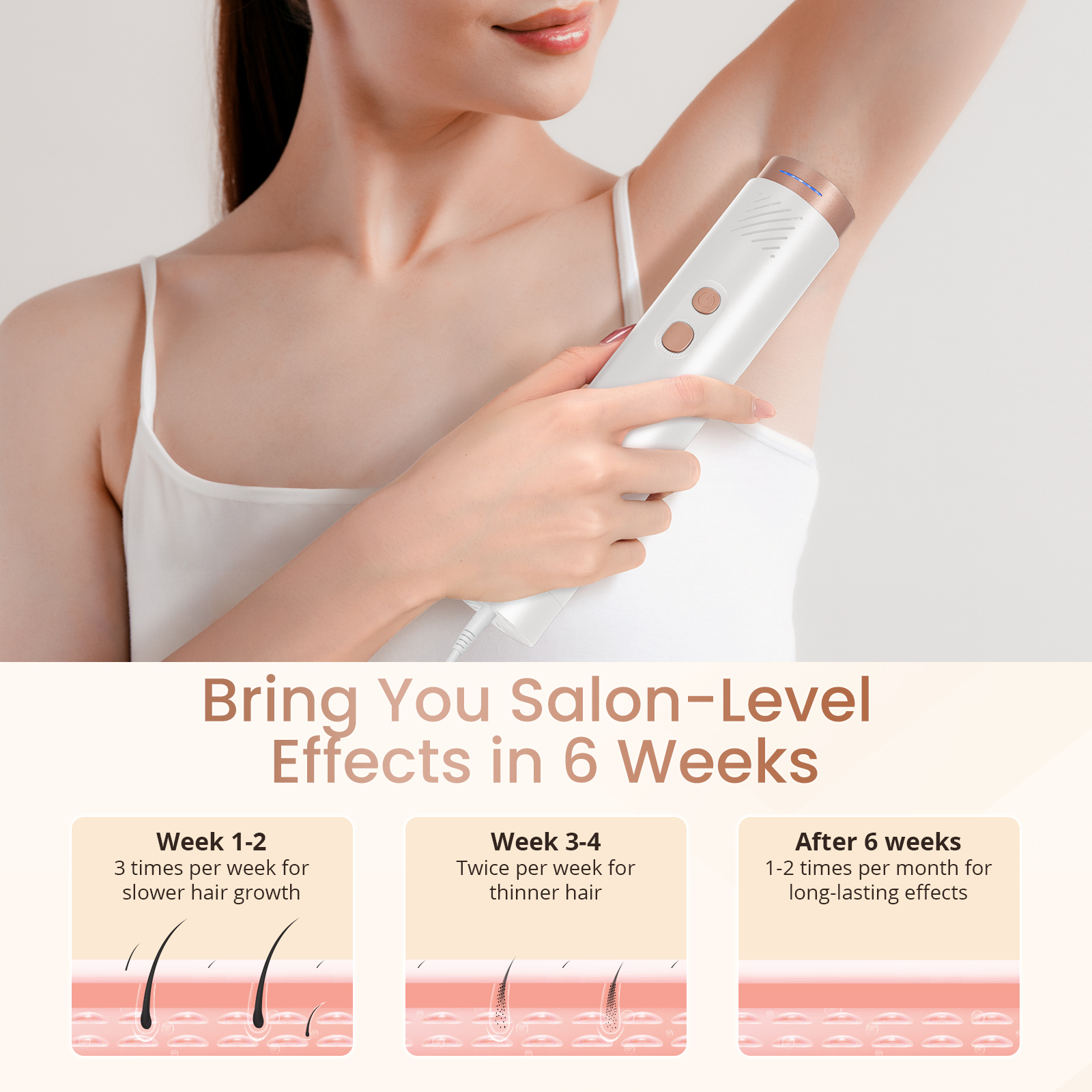 💖Visible Results in Just 2 Weeks*: Our IPL hair removal device features advanced IPL technology that brings visible hair reduction in just 2 weeks*. Use it consistently 3-4 times a week for the first two weeks to achieve 93.64% hair reduction and slower hair regrowth. Achieve permanent hair removal within 8 weeks. (Insist on regular use)