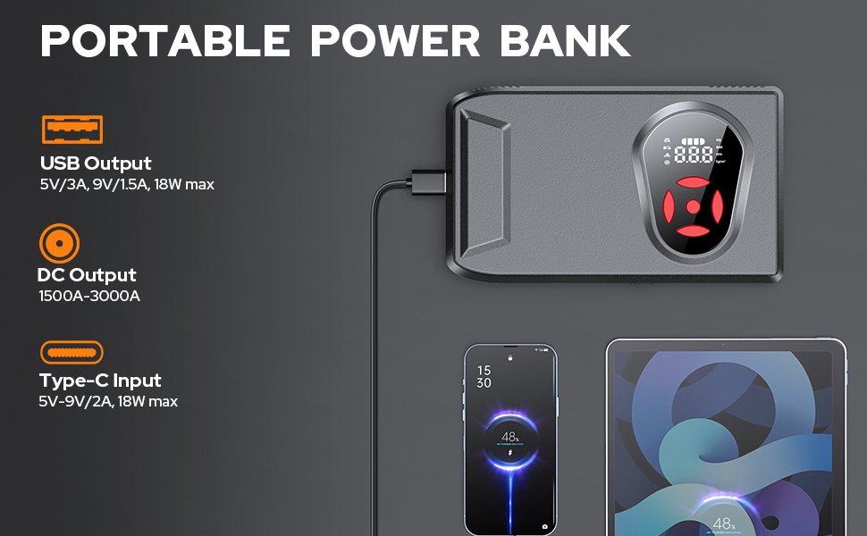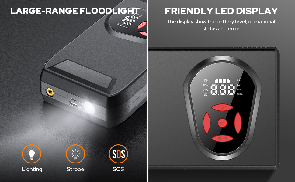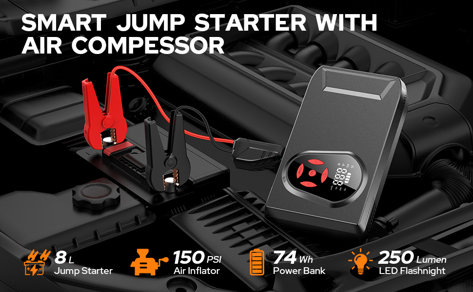 Jump Starter with Air Compressor instantly jumpstart a battery with 3000A cranking power, start all 12V vehicles (up to 9.0 L gas and 8.0 L diesel engine). It's universal compatible with cars, trucks, motorcycles, lawnmowers, SUV, snowmobiles, boats etc.
