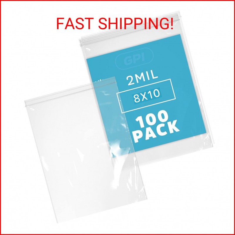 8" x 10" Zip Bags, 100 Pack, Clear Plastic Reclosable Poly Baggies, 2 mil with Resealable Zip Top Lock for Storage & Packaging Food, Snacks, Pharmaceutical & Industrial Supplies. GPI