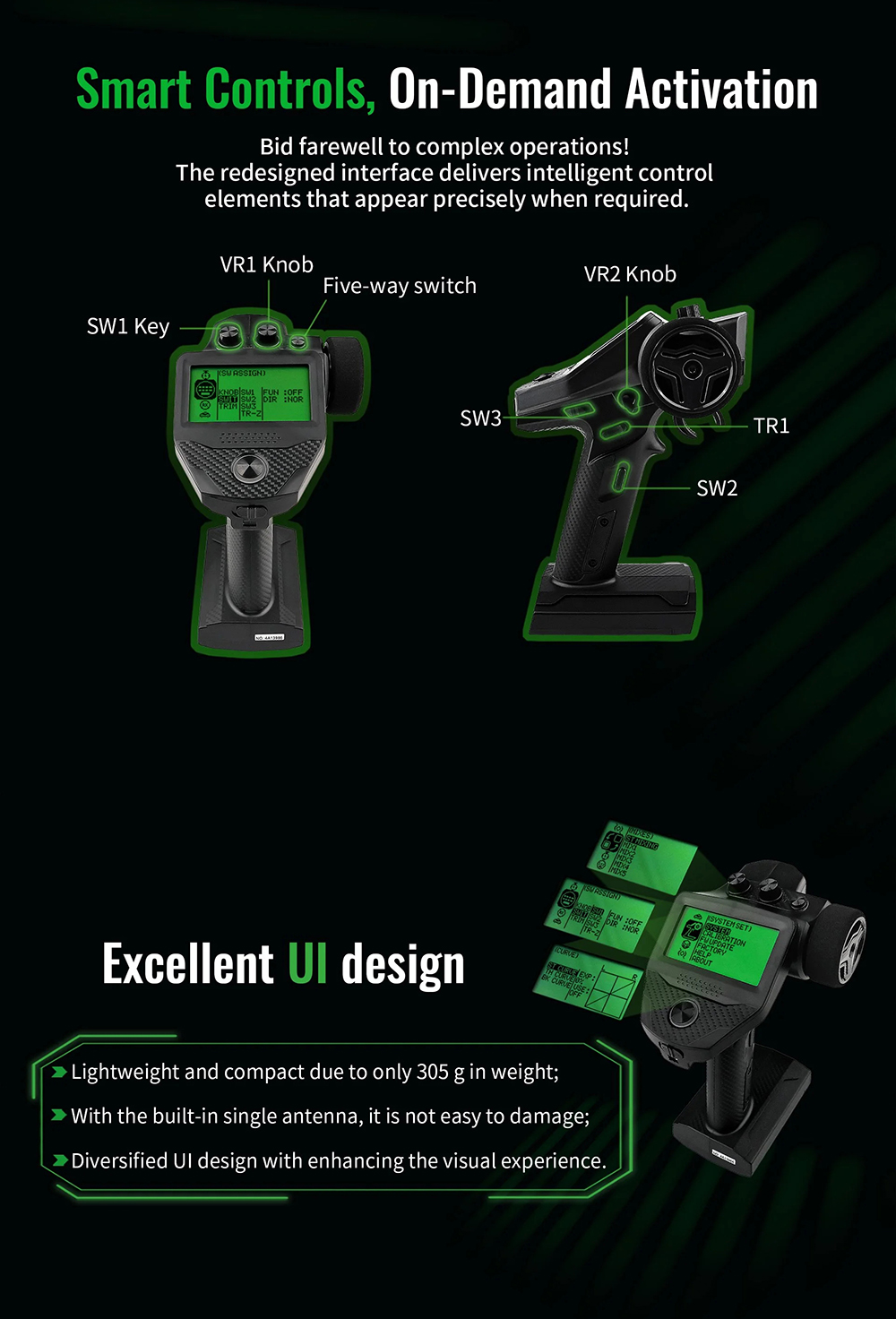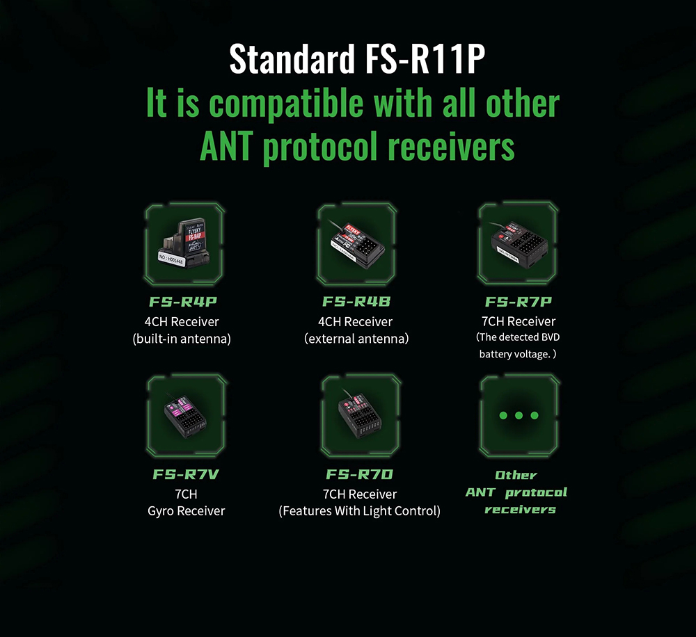 FS-G7P+is an upgraded version of FS-G7P, with channels increased from 7 to 10 and increased memory to store more data. It is compatible with FX-R4P, FS-R4B,FS-R7P,FSR7V,FSR7D receivers, as well as other receivers that support ANT protocol.