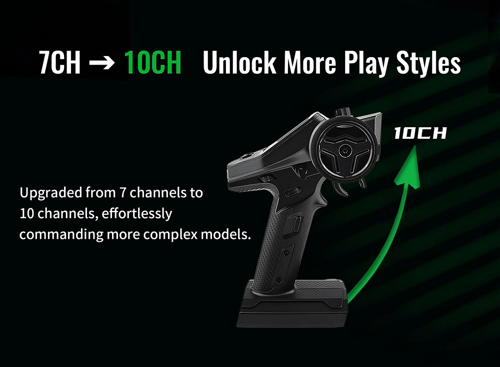 1. G7P to G7P+,Upgraded from 7 channels to10 channels, effortlesslycommanding more complex models.