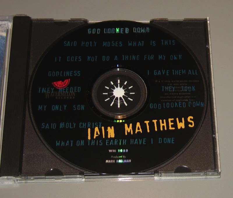 Iain Matthews - "God Looked Down" CD. Release Year: 1996. Label: Watermelon Records. Catalog Number: CD1055. CD is in very good condition. Booklet is in very good condition. Rear inlay is in very good condition.