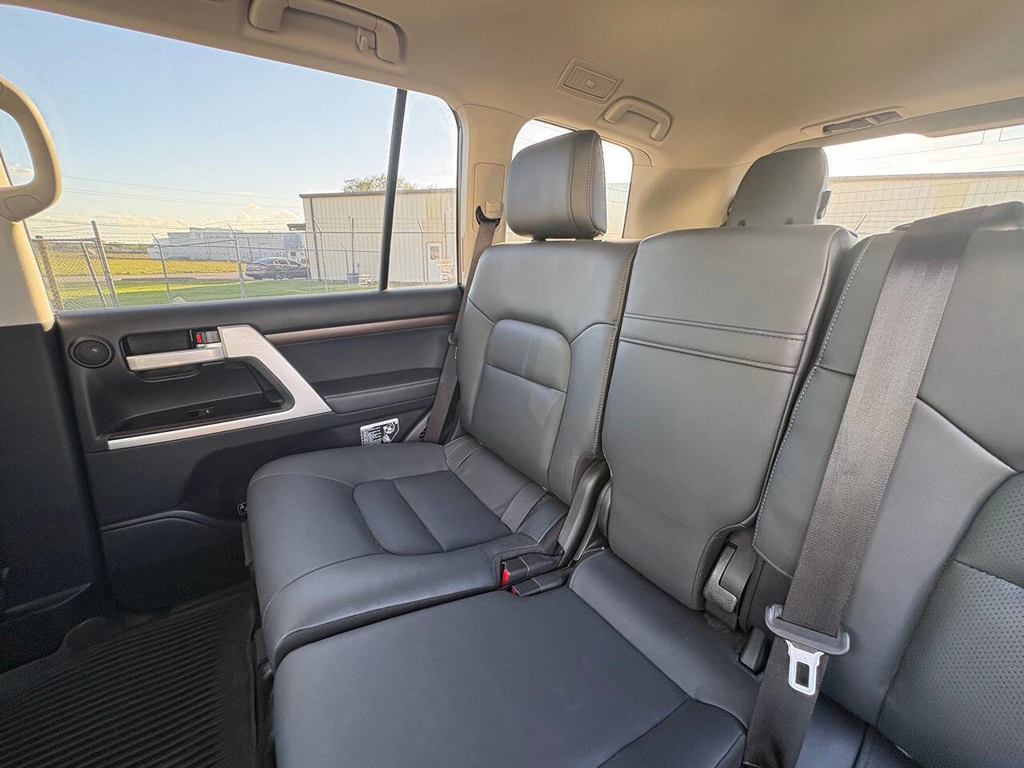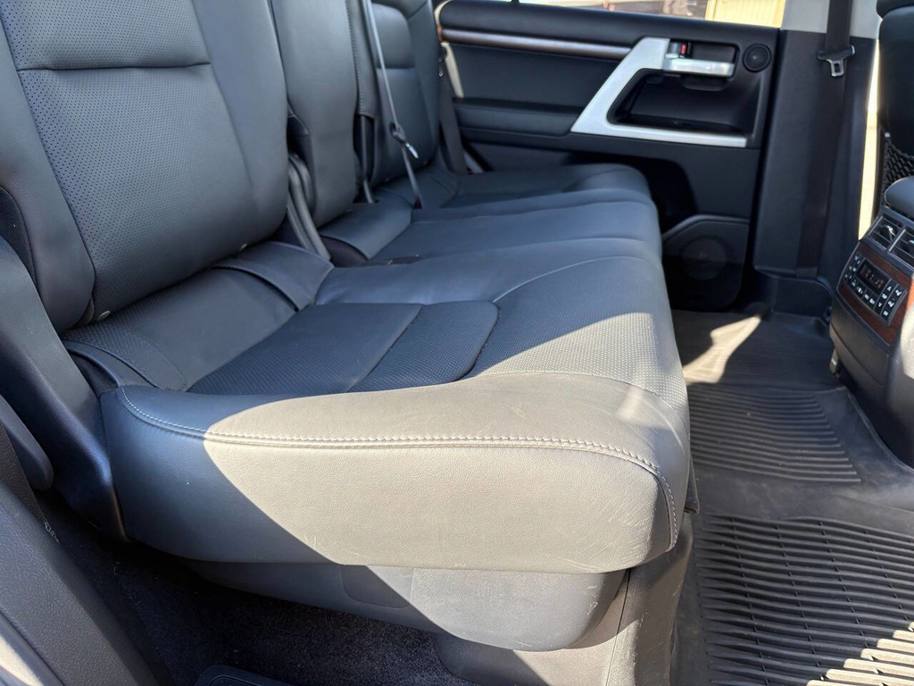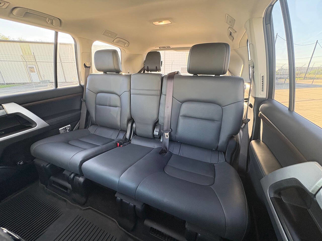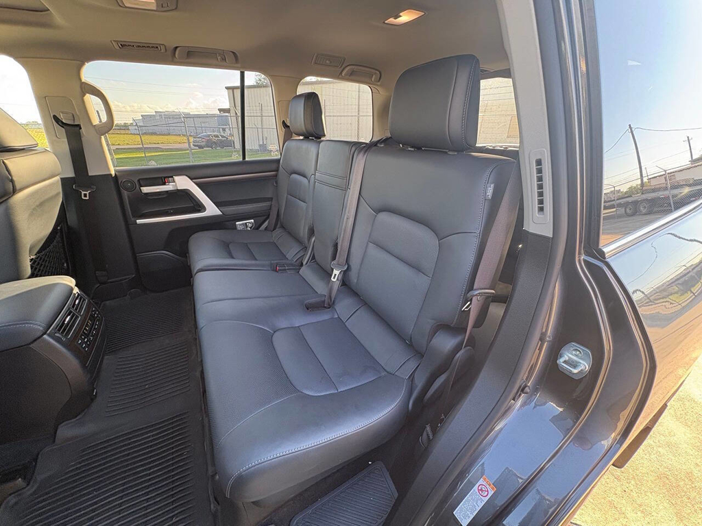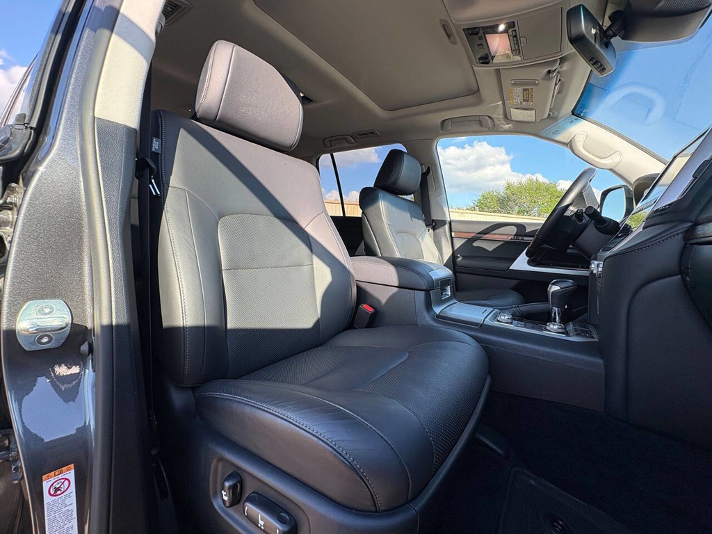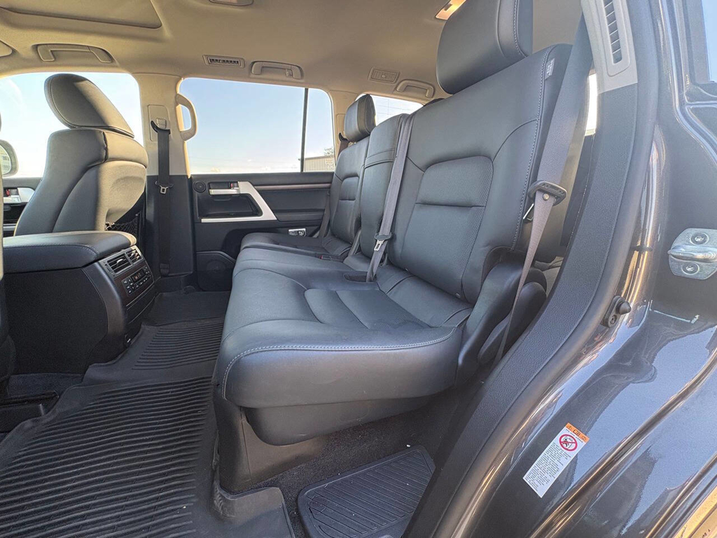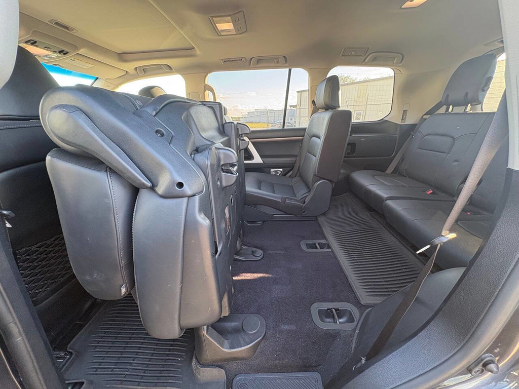 Inside, the cabin is both functional and upscale, trimmed in black leather with silver accents and designed to provide long-distance comfort in nearly any environment. The front power-adjustable seats are heated and ventilated, giving both driver and passenger a premium experience, while rear climate controls help keep passengers comfortable throughout the cabin. The power sunroof brightens the interior, and the third-row seating adds flexibility for larger families or additional passengers when needed. This Land Cruiser also delivers the commanding driving position enthusiasts appreciate, along with the solid, vault-like feel that has helped make the model so admired.