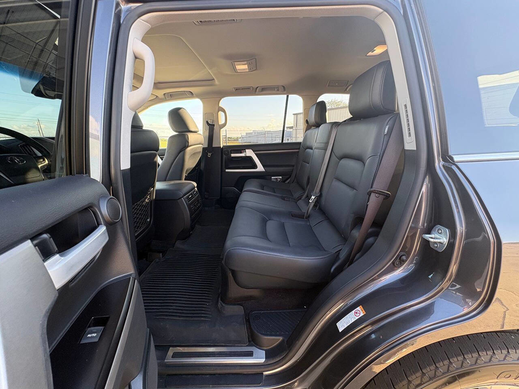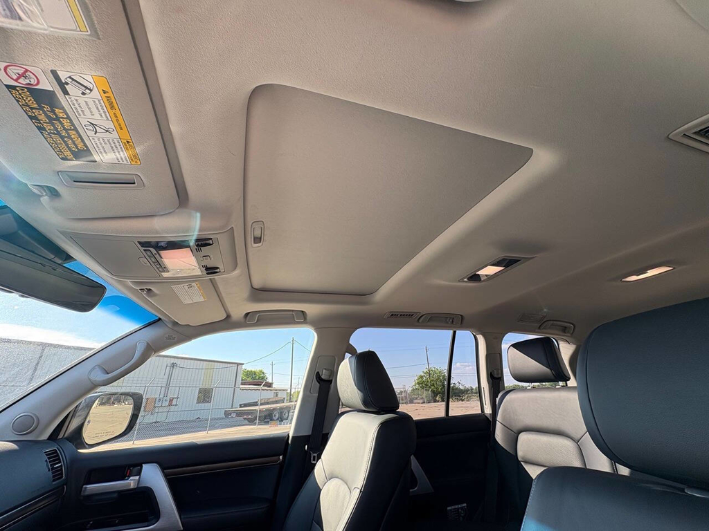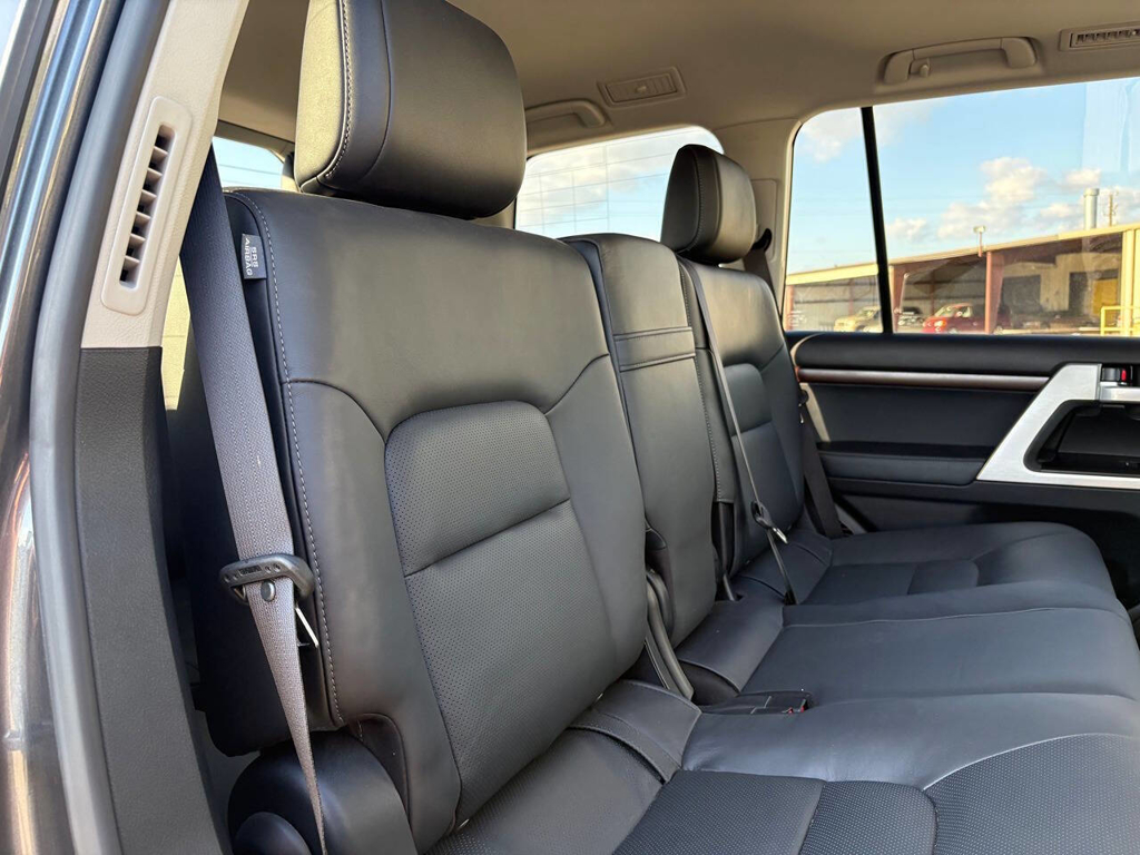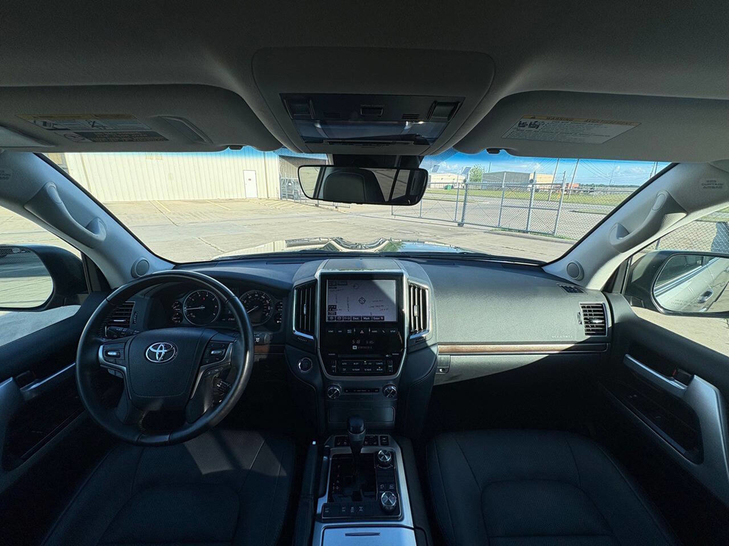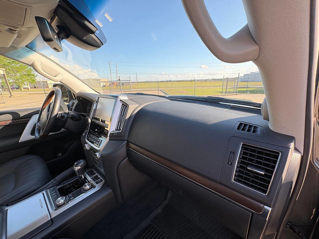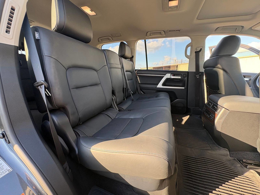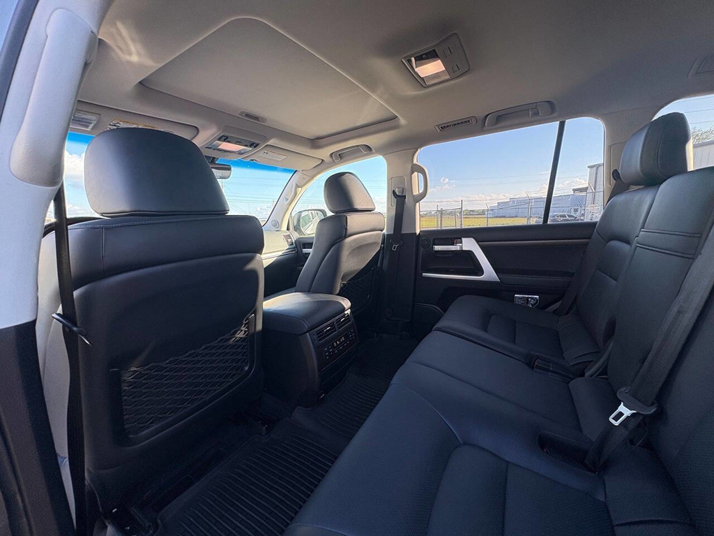Inside, the cabin is both functional and upscale, trimmed in black leather with silver accents and designed to provide long-distance comfort in nearly any environment. The front power-adjustable seats are heated and ventilated, giving both driver and passenger a premium experience, while rear climate controls help keep passengers comfortable throughout the cabin. The power sunroof brightens the interior, and the third-row seating adds flexibility for larger families or additional passengers when needed. This Land Cruiser also delivers the commanding driving position enthusiasts appreciate, along with the solid, vault-like feel that has helped make the model so admired.