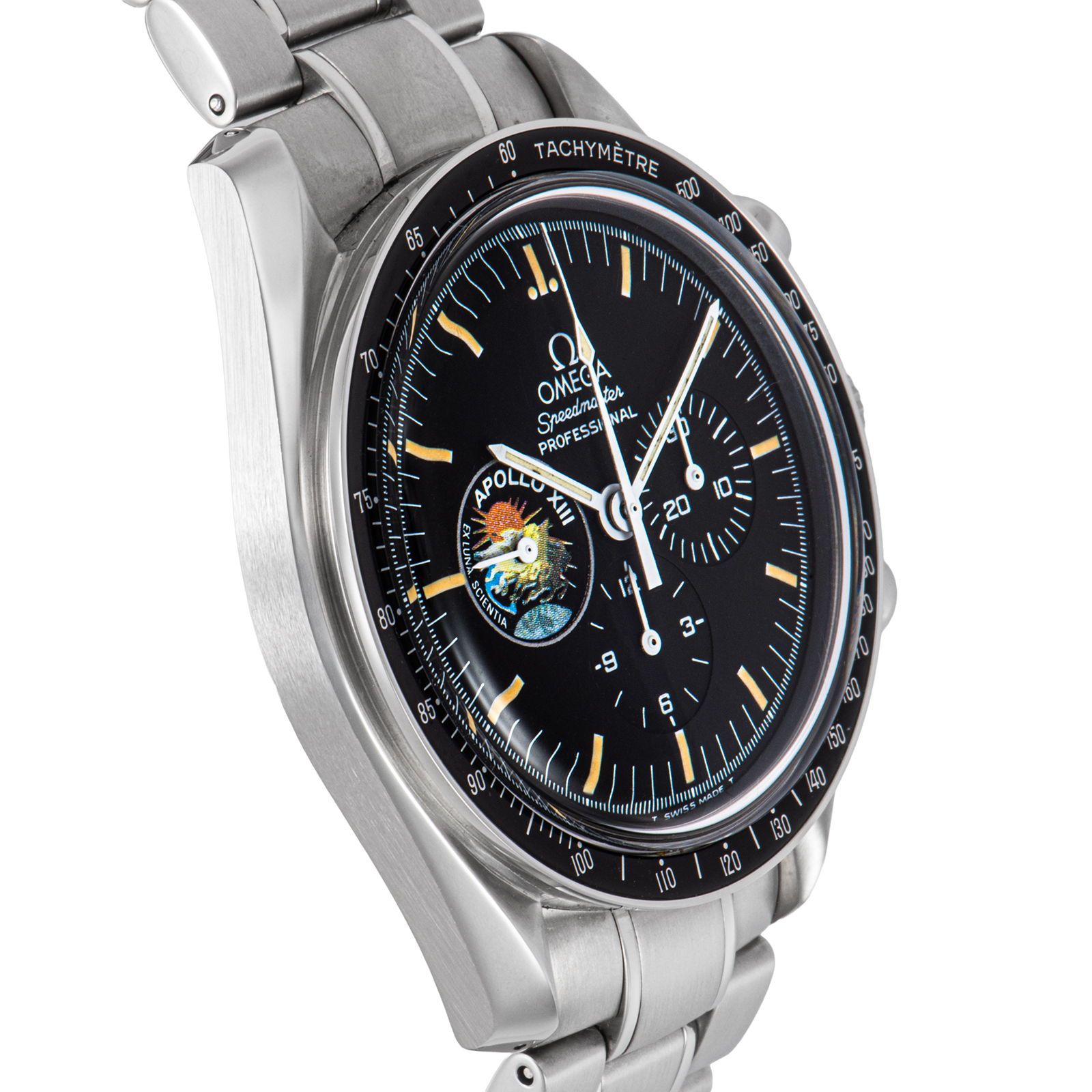 | item Description | This rare model was produced in 1995 to commemorate the 25th anniversary of the Apollo 13 moon landing, and is limited to 999 pieces worldwide. Both the hands and dial are tritium luminous, and the paint on the indexes has an even tan, giving it the feel of a vintage watch. This is a very rare piece perfect for collectors, with all the accessories included and the original back cover sticker still attached. |