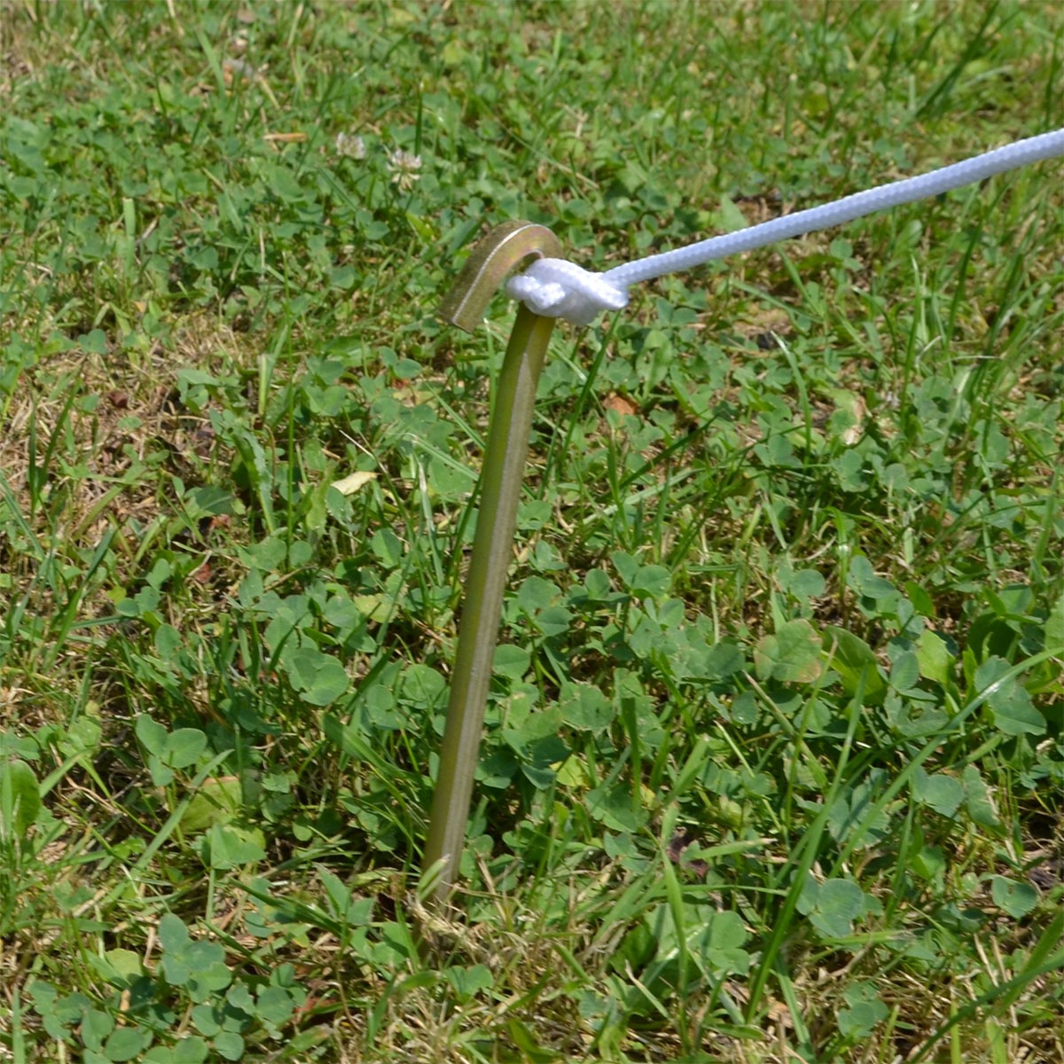 Bei härterem Boden nehmen Sie einfach den Camping-Hammer. Die Öse am oberen Ende der Zelthaken verhindert, dass die Abspannleine abrutscht.