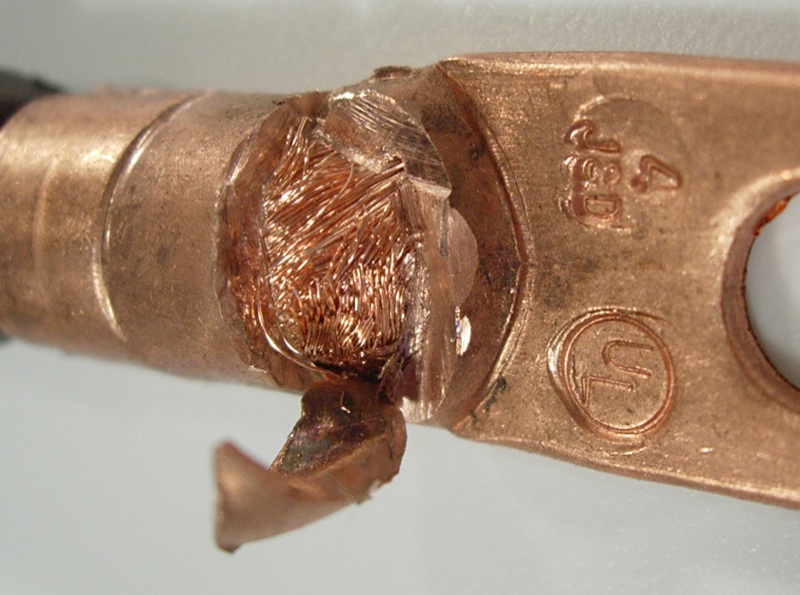 2) cutaway of the type of high purity copper terminals we use and our technique of stripping our wire long and then forcing it into the closed ended terminals to maximize the area of contact between the strands and the copper terminal